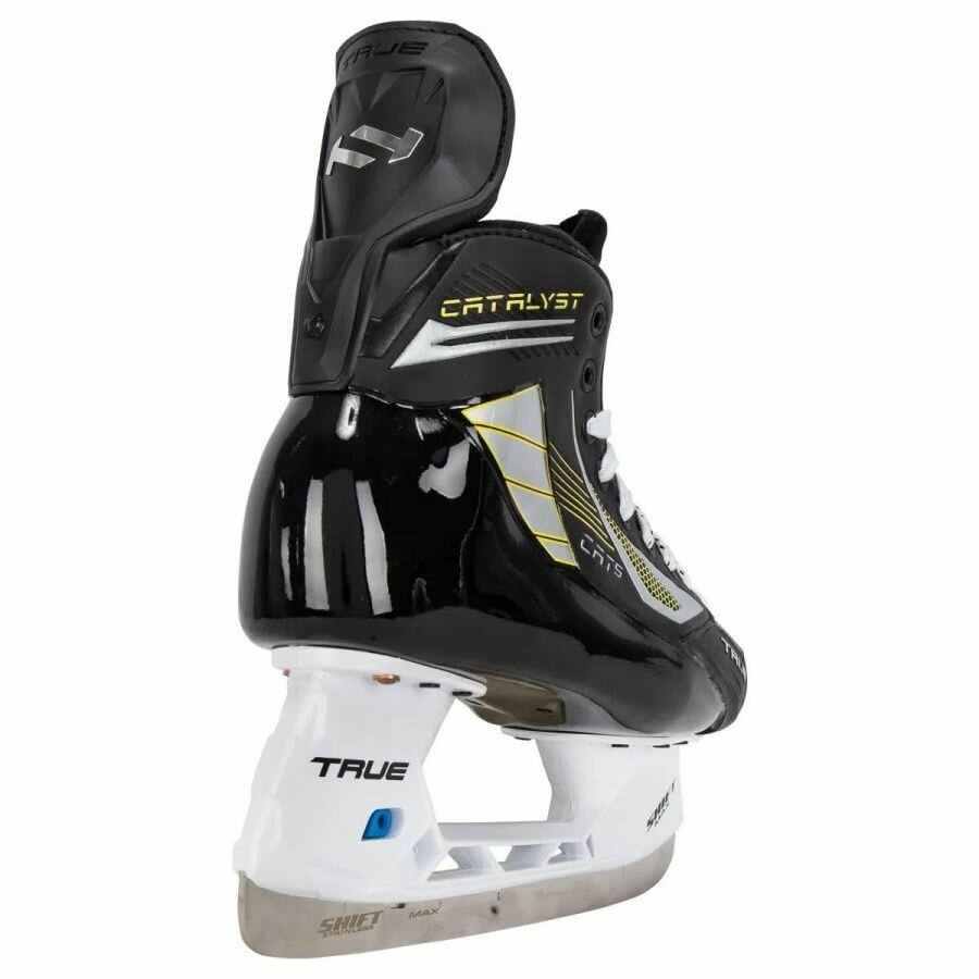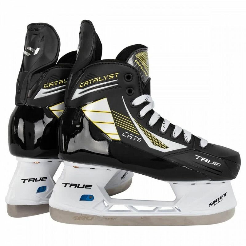 В новых коньках Catalyst 5 игрок может получить ключевые особенности коньков True. Монолитный ботинок с умеренной жесткостью. Catalyst 5 предлагает лучшее соотношение цены и характеристик в своем классе. Внутренний лайнер среднего уровня. Язык из войлока среднего уровня с защитной вставкой T-Guard. Внутренняя набивка ботинка из пены среднего уровня. Лезвие SHIFT MAX из стали 7cr