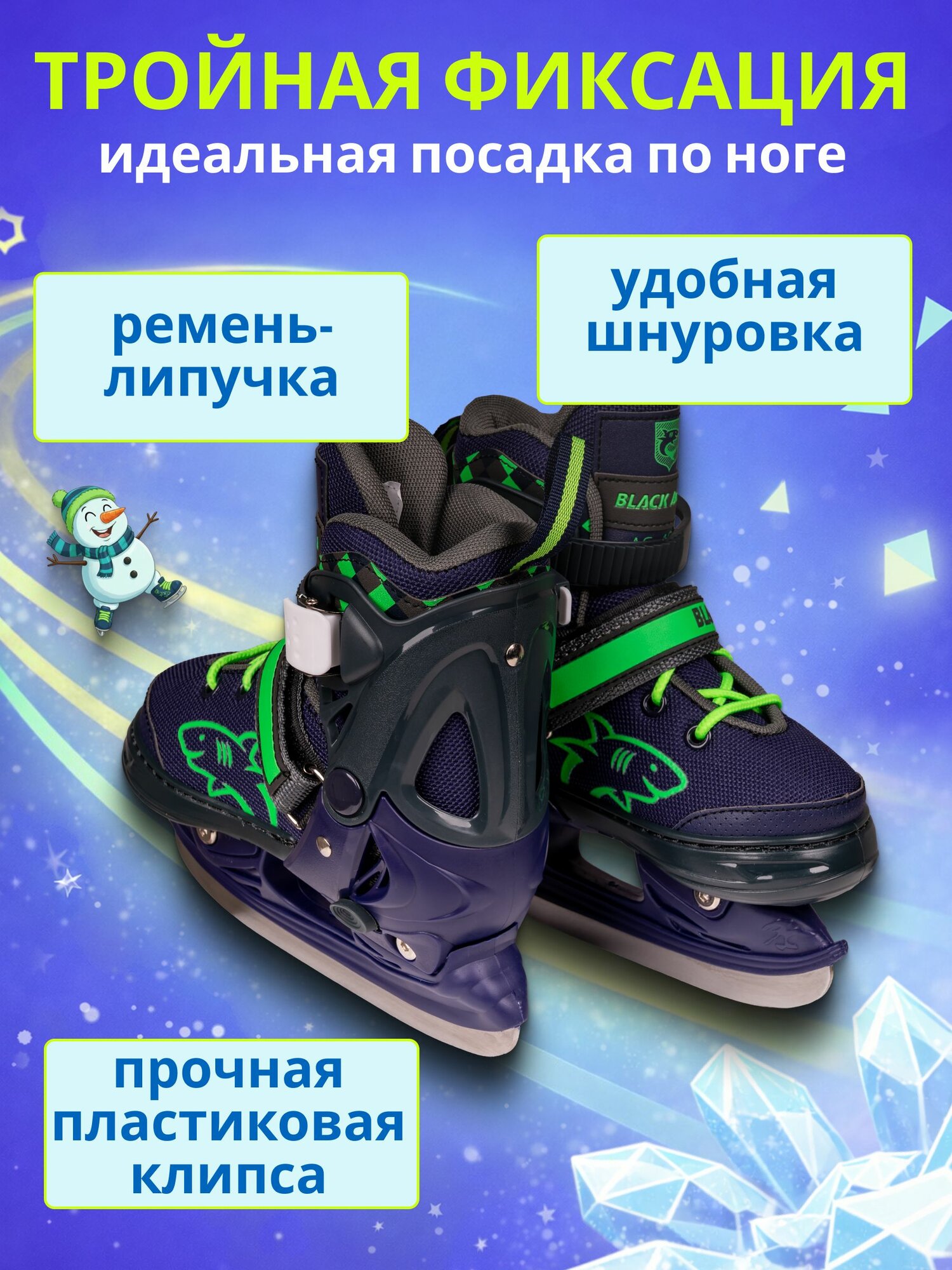 Коньки раздвижные BlackAqua AS-408 — удобная модель для катка на каждый день. Детские коньки кроссовочного типа: мягкий ботинок комфортно сидит на ноге и помогает быстро привыкнуть к льду, подходят для обучения и активного отдыха. Подходят для детей и для подростков, универсальны для девочки и для мальчика. Регулировка на 4 размера позволяет кататься несколько сезонов. Технические характеристики: • Верх: нейлон, синтетическая кожа, ударопрочный пластик • Внутри: утеплитель из искусственных материалов • Фиксация: быстрая шнуровка, ремень-липучка Velcro, пластиковая клипса • Лезвие: нержавеющая сталь, снижает потребность в частой заточке • Регулировка размера: 4 положения, простая настройка под растущую ногу ребенка • Комплектация: пара коньков и брендированная сумка-чехол для переноски и сезонного хранения, защита от пыли и механических повреждений. Преимущества: • Раздвижной механизм экономит бюджет • Мягкий ботинок и утеплитель уменьшают натирание и сохраняют тепло • Тройная фиксация надежно удерживает стопу • Прочный каркас поддерживает голеностоп • Лезвия из нержавеющей стали дают стабильное скольжение • Сумка-чехол упрощает транспортировку. Раздвижные коньки для детей BlackAqua - практичный подарок на Новый год и на День рождения. Выбирая эту модель, вы обеспечиваете безопасность и положительные эмоции для ребенка на всю зиму.