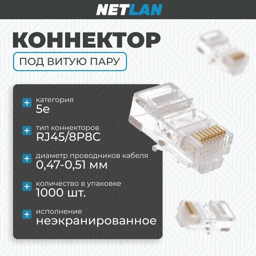 Купить Коннектор NETLAN RJ45/8P8C, категория 5e, 3 мкд, универсальный, 1000шт. EC-UP8P8C-5E-003-TR-1000 с доставкой по всей России.