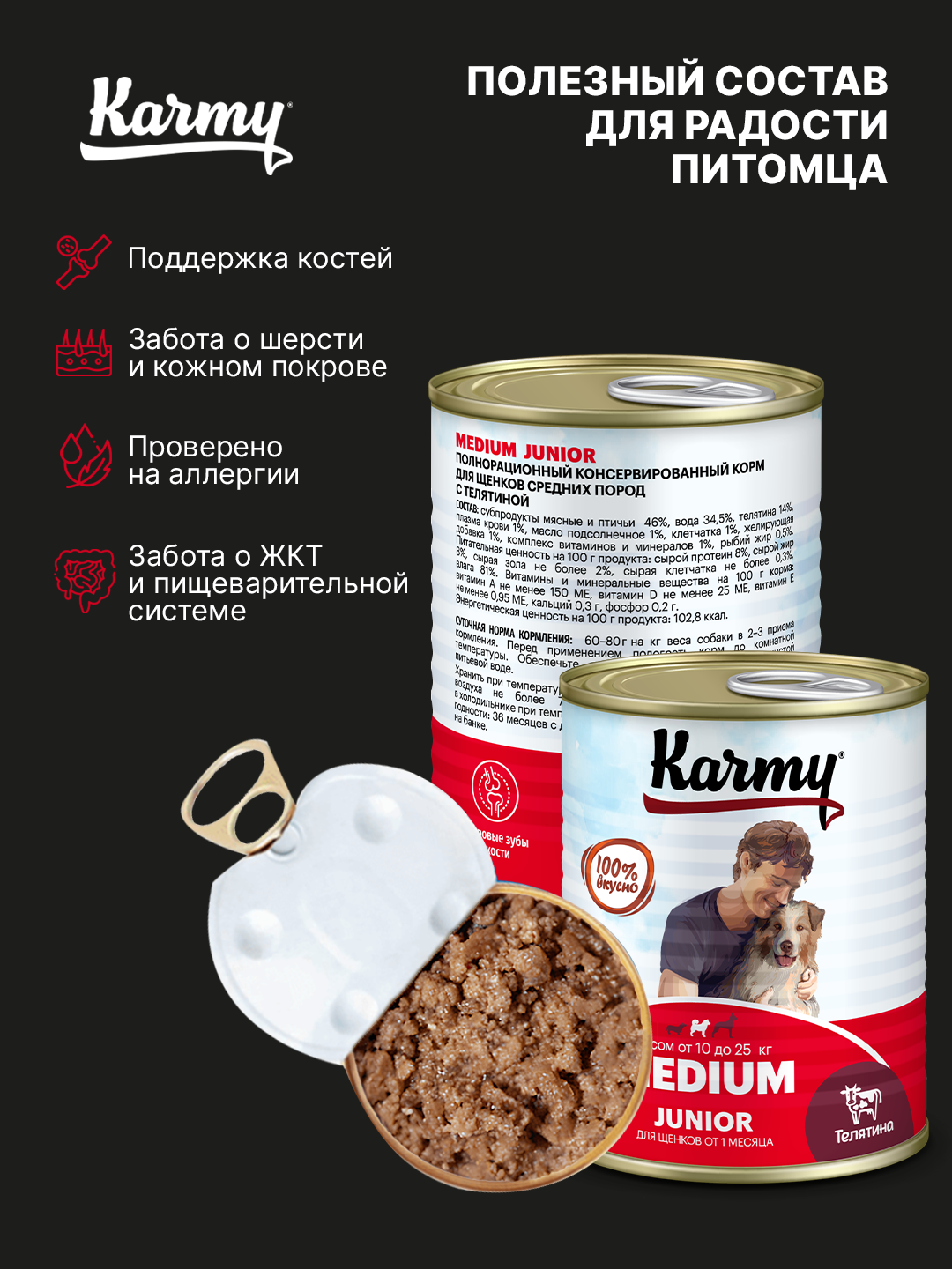 Консервированный корм KARMY MEDIUM Junior для щенков средних пород Телятина 12 шт, 340г.: сравнение цен, характеристики, фото, актуальное наличие и цены.
