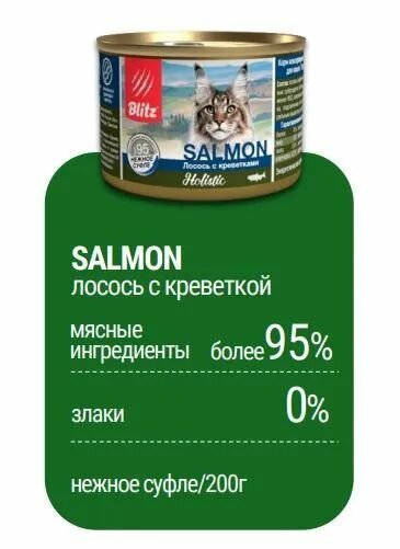 Уникальная рецептура, тщательный выбор компонентов и бережная обработка делают суфле Blitz Holistic «Лосось с креветками» отличным выбором для кошек, знающих себе цену!