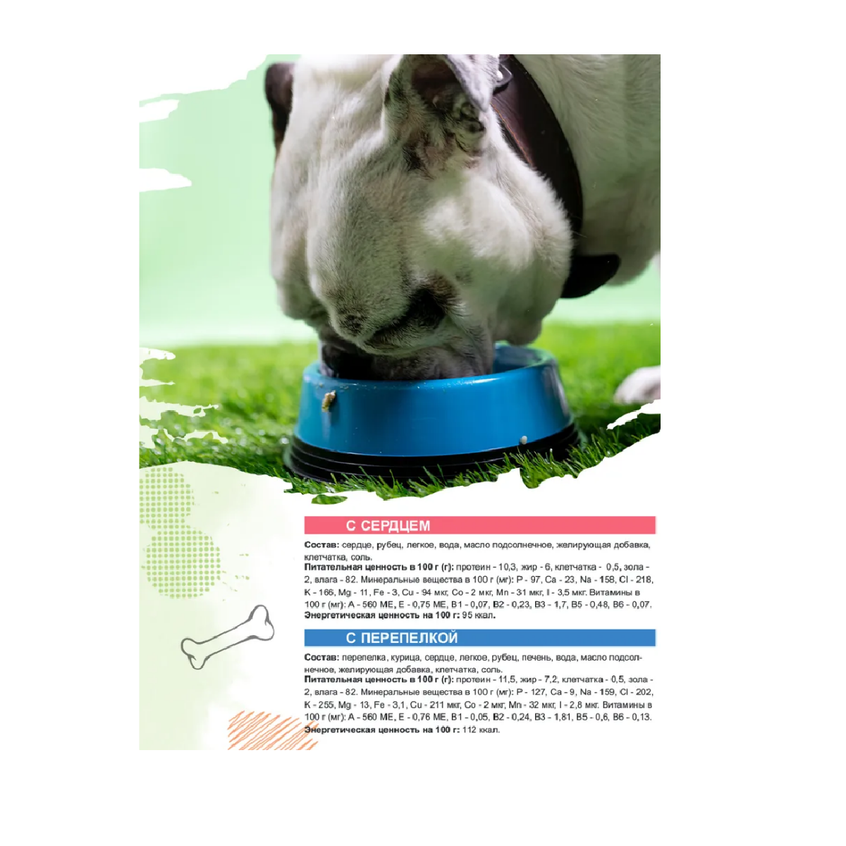 “Мясное ассорти” подходит для щенков всех пород с 6 месяцев для ежедневного кормления или как дополнение к основному рациону.