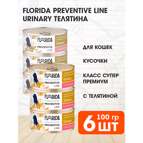 Florida Preventive Line это линейка профилактических кормов для питомцев с разными физиологическими потребностями в питании. Рационы Florida Preventive Line содержат питательные компоненты, которые необходимы для поддержания здоровья и профилактики развития различных заболеваний у взрослых кошек и собак. Линейка Florida Preventive Line объединяет в себе природную пользу и современные технологии. Для производства используются высококачественное мясо и натуральные растительные ингредиенты, которые выращиваются и собираются вручную в экологически чистых районах России. Мясные консервы Florida Preventive Line Urinary полнорационный диетический профилактический корм, который предназначен для поддержания здоровья мочевыделительной системы и профилактики образования струвитных уролитов . Перед применением корма рекомендуем проконсультироваться с ветеринарным врачом. Не содержит искусственных красителей, ароматизаторов или консервантов, ГМО. Состав: утка, индейка, субпродукты куриные (желудок, печень), плазма крови, масло льняное, клетчатка, отруби пшеничные, яичный порошок, таурин, дрожжи, рыбий жир, морские водоросли, юкка Шидигера, клюква, травы почечный сбор, желе. Питательная ценность на 100 г: сырой протеин 10,0% сырой жир 7,0% углеводы 2,0% Витамин А 2000 МЕ витамин D 200 МЕ витамин Е 3,5 МЕ кальций 120 мг фосфор 100 мг Энергетическая ценность на 100 г: 101 ккал. Рекомендации по кормлению: 30-40г на 1кг веса кошки. Суточная норма может варьироваться в зависимости от возраста, комплекции и уровня активности вашего питомца. Не забывайте своевременно пополнять миску свежей питьевой водой. Возможно смешанное кормление (сухой + влажный корм). Условия хранения: от 0 С до 25 С и относительной влажности воздуха не более 75%. Срок годности: 2 года с даты изготовления. Корм Florida Preventive Line Urinary для кошек, для профилактики МКБ, с телятиной, 100 г х 6 шт