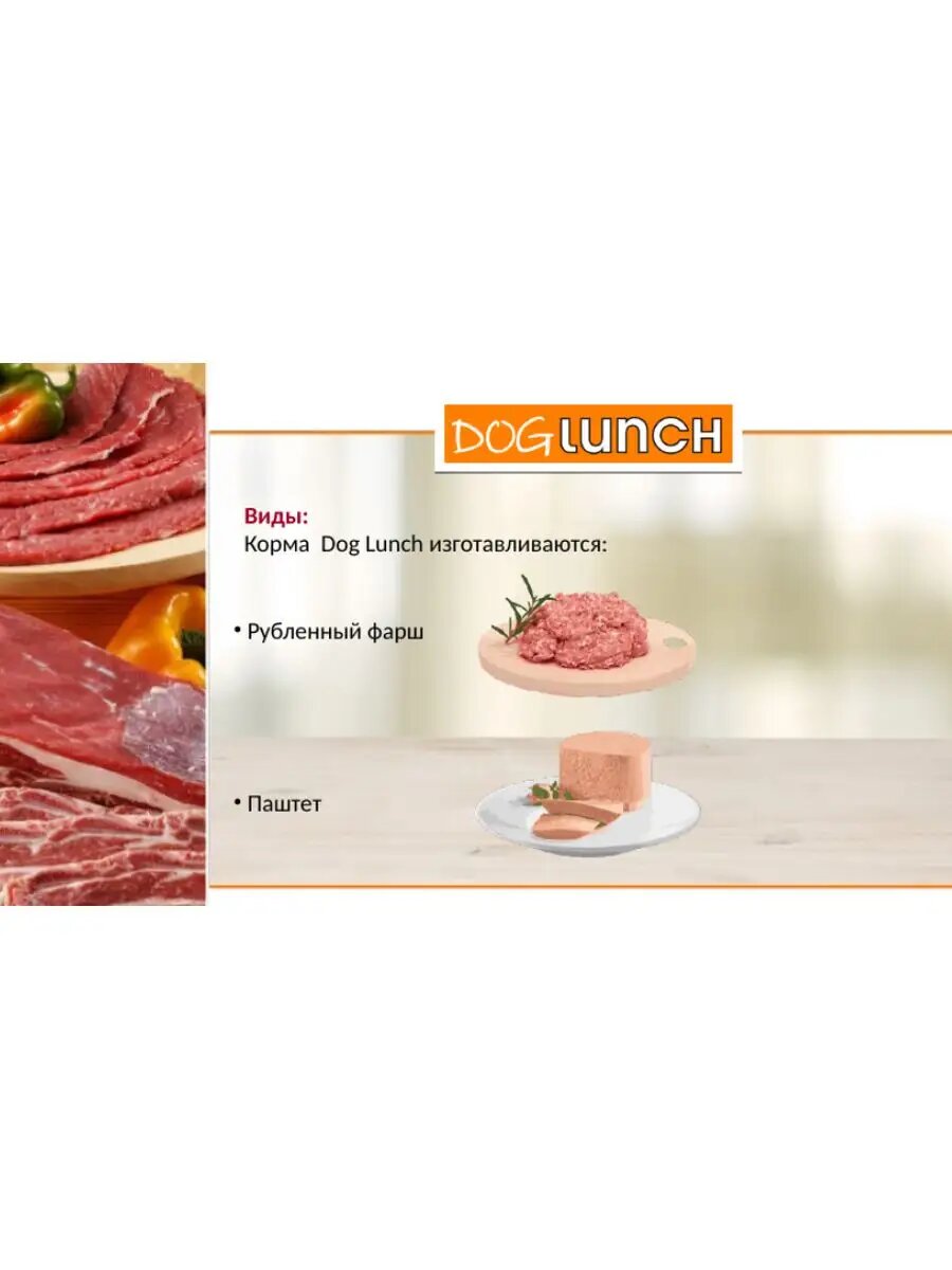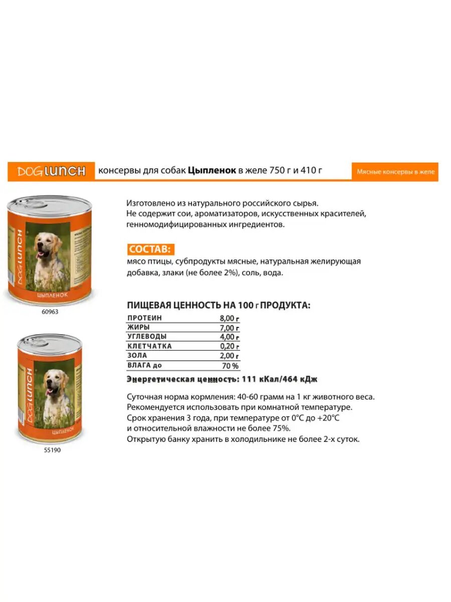 Влажный корм для собак DogLunch изготовлен из качественного российского сырья. Не содержит сои, консервантов, искусственных красителей, ароматизаторов и генномодифицированных ингредиентов. Срок годности 3 года при температуре от 0°С до +25°С и относительной влажности не более 75%. Открытую банку хранить в холодильнике не более 2-х суток. Рекомендуемые нормы корма в сутки: 40 - 60 г на 1 кг веса животного. Рекомендуется давать корм комнатной температуры.
