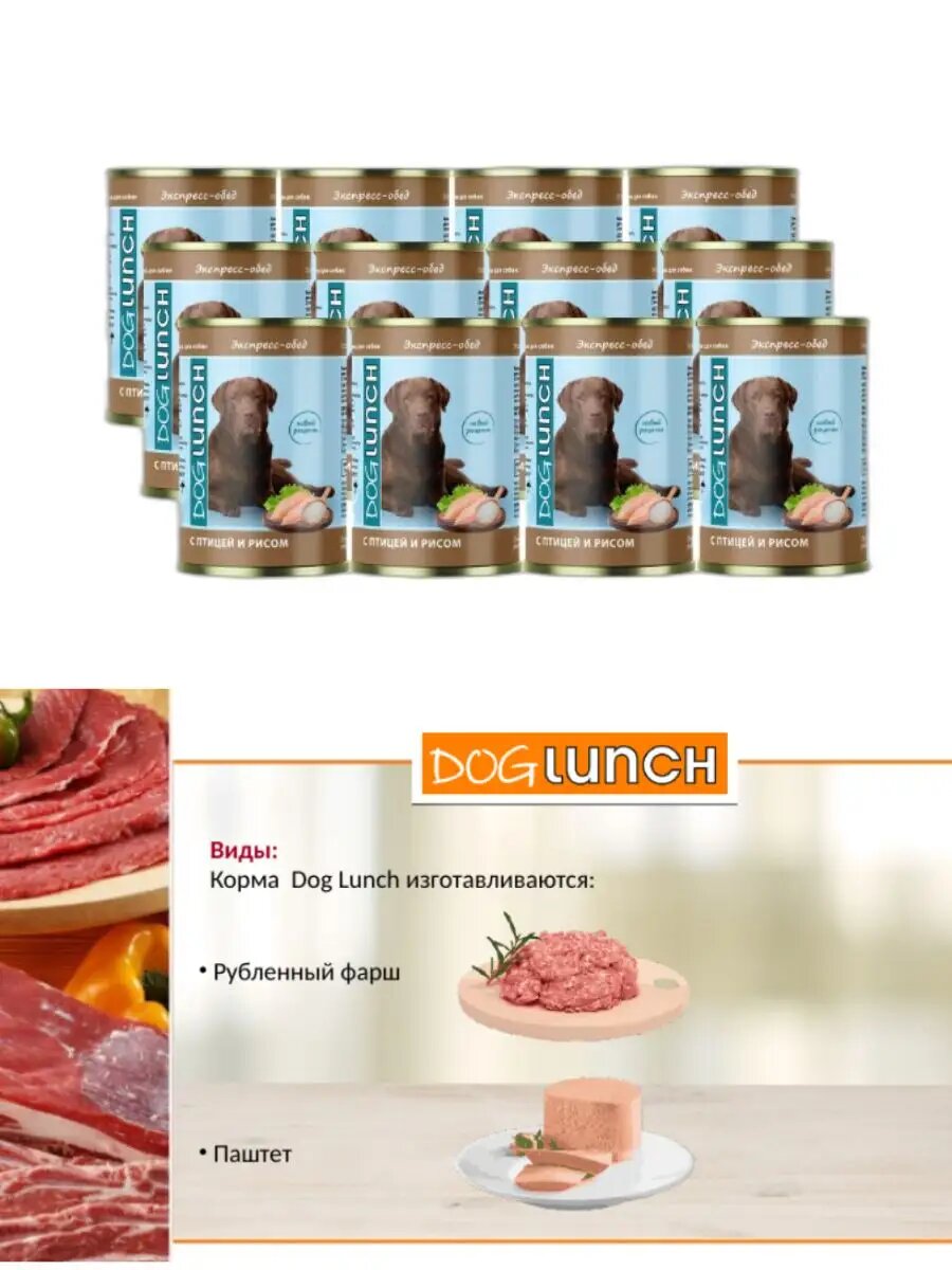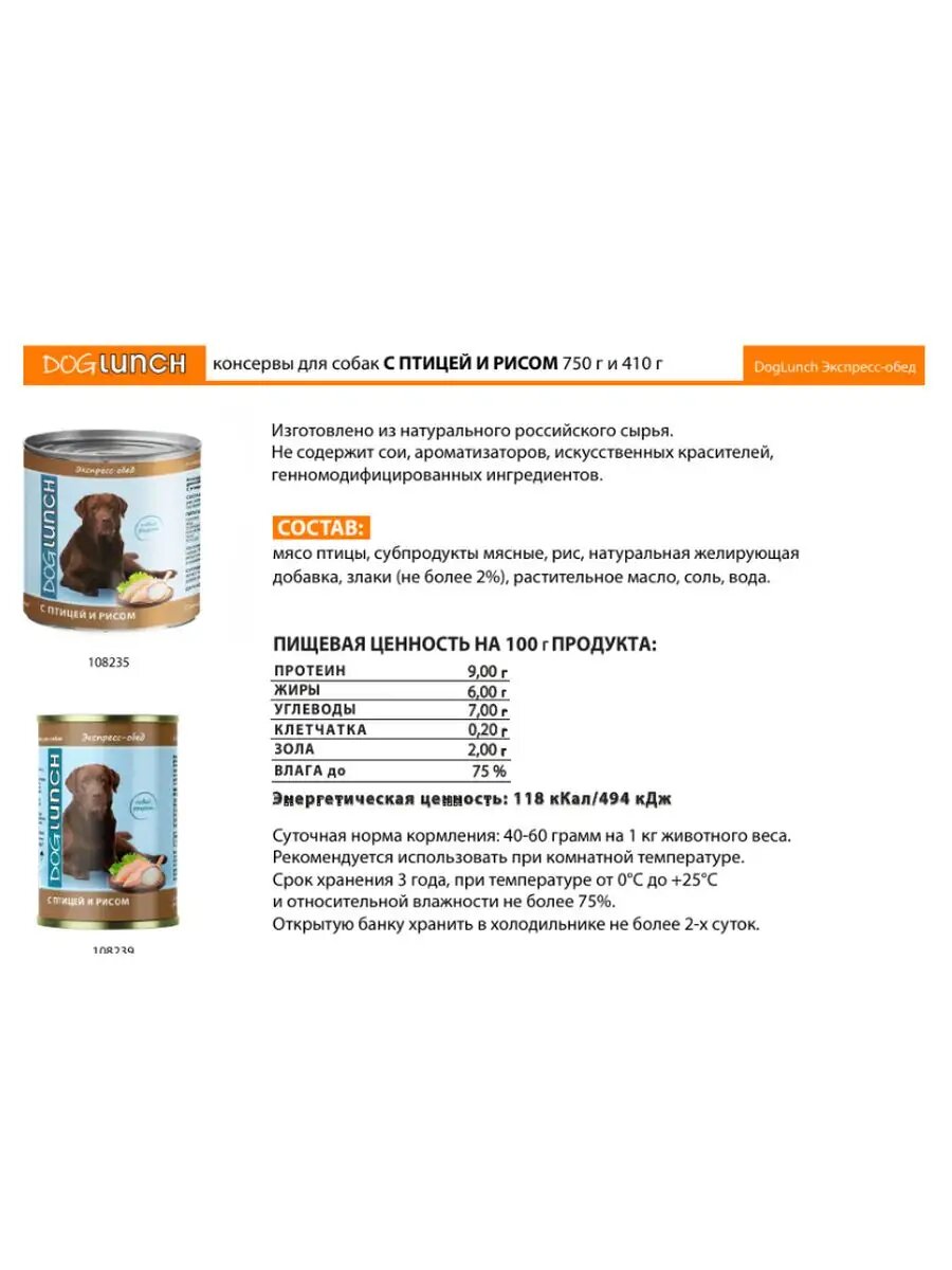 Влажный корм для собак DogLunch изготовлен из качественного российского сырья. Не содержит сои, консервантов, искусственных красителей, ароматизаторов и генномодифицированных ингредиентов. Срок годности 3 года при температуре от 0°С до +25°С и относительной влажности не более 75%. Открытую банку хранить в холодильнике не более 2-х суток. Рекомендуемые нормы корма в сутки: 40 - 60 г на 1 кг веса животного. Рекомендуется давать корм комнатной температуры. Пищевая ценность: протеин - 9,0 г, жир - 6,0 г, углеводы - 7,0 г, клетчатка - 0,2 г, зола - 2,0 г, влага - до 75%. Энергетическая ценность – 118 ккал/494 кДж.