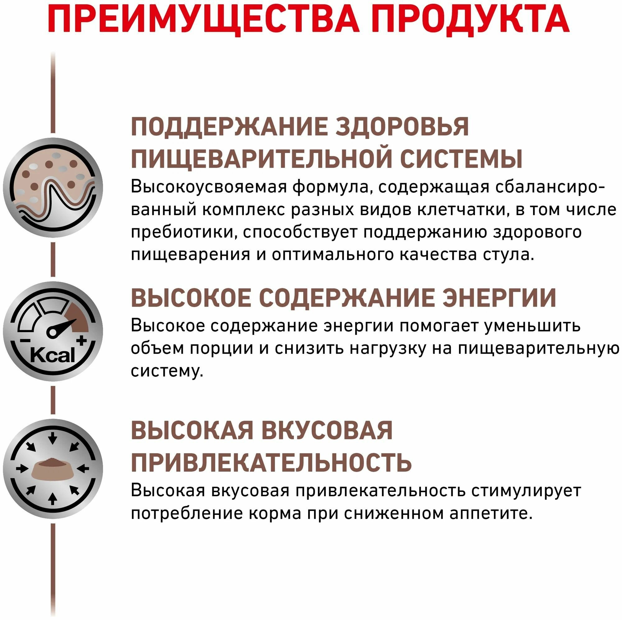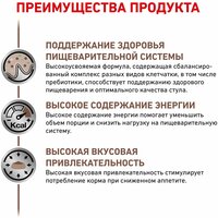 Royal Canin Gastro Intestinal сanine диетический корм для собак, имеющих проблемы с пищеварительной системой. Рекомендуется предварительная консультация с ветеринарным врачом. Корм назначается при следующих заболеваниях: острая и хроническая диарея, хроническое воспаление кишечника, плохая переваримость и абсорбция питательных веществ, восстановительный период после болезни, пролиферация бактерий в тонком кишечнике, экзокринная недостаточность поджелудочной железы, колиты, гастрит, анорексия. Длительность применения диеты варьируется в зависимости от тяжести симптомов нарушения пищеварения. Для оптимальной работы пищеварительной системы необходимо соблюдение суточного рациона и увеличение его кратности кормлений в день.