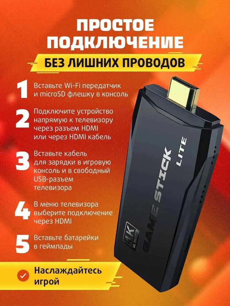 Игровая приставка на телевизор содержит коллекцию эмуляторов легендарных игровых консолей 90-х годов, включая в себя игры от PlayStation 1, Sega, Dandy, Super Nintendo, Atari, Game Boy и других. Данная портативная игровая консоль для детей совместима с телевизорами, проекторами, ноутбуками и мониторами, поддерживает UltraHD 4K качество изображения и содержит более 22000 ретро игр из вашего детства. C нашей приставкой вы сможете вспомнить старые добрые времена и пройти три-четыре уровня в Mario или Тетрис, зарубиться в Mortal Kobmat или Tekken, насладиться легендарными гонками на PS1. Наши беспроводные игровые приставки могут понравиться как детям, так и взрослым, которые вспоминают дни детства, когда детская электроника только зарождалась, и которые мечтали сидеть перед телевизором днями напролет. Вам больше не нужно покупать старые громоздкие игровые консоли и игры. Просто подключите наши портативные игровые приставки к телевизору через разъем HDMI, включите беспроводные 2.4G wireless геймпады и погрузитесь в ностальгические 8, 16 и 32-битные детские игры прошлого на нашей консольке, не встававя с дивана. На игровой ТВ консоли можно найти все ваши любимые игрушки от дэнди, плейстейшн 1, сега, нинтендо, геймбой, атари и др. Беспроводная ретро консоль оснащена современным процессором, что позволяет ей выдавать качество картинки, приближенное к UltraHD. Когда ваш ребенок только знакомится с миром видеоигр, то нет необходимости сразу приобретать ему дорогостоящие игровые консоли, они слишком сложны для маленьких геймеров, тогда как наша преставка гейм стик лайт отлично справится с ролью первой пробной игровой приставки. Мы убеждены, что игры для детей должны быть не только интересные, но и познавательные и как раз такие детские игрушки и установлены на нашей консольке. На устройство предоставляется гарантия.