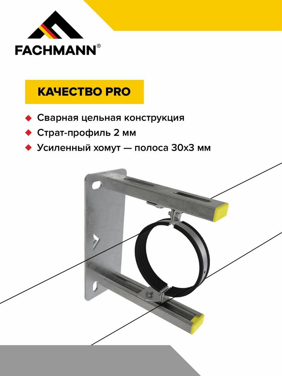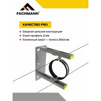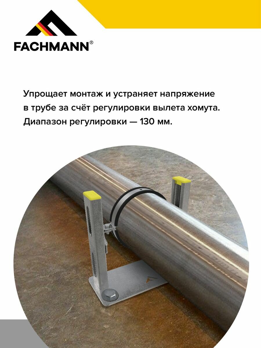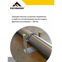 Опорная консоль FACHMANN применяется для монтажа трубопроводов, вертикальных стояков диаметром 110 мм. Крепёжный кронштейн устраняет напряжение в трубе за счет регулировки вылета хомута. Диапазон регулировки — 130 мм.