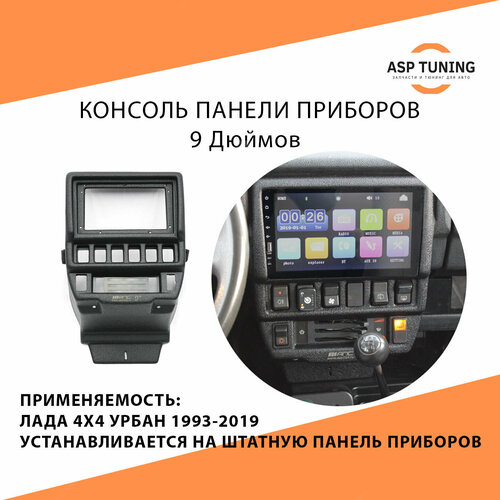 Консоль предназначена для установки на штатную панель приборов 21213(21214, 21218)-5325010 (с рычажным блоком управления отопителем) автомобиля LADA 4x4 (ВАЗ 2121 и модификации, в том числе в комплектации URBAN), взамен штатной консоли (панели крепления радиоприемника). Используется в качестве переходной рамки для магнитолы 9 дюймов.