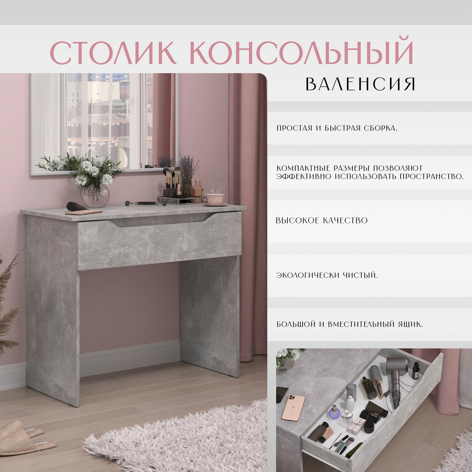 Купить Консольный столик LETTA Валенсия Бетон, с ящиком, 90х42х76 см, ЛДСП с доставкой по всей России. Консольный столик LETTA Валенсия Бетон, с ящиком, 90х42х76 см, ЛДСП: сравнение цен, характеристики, фото, актуальное наличие и цены.