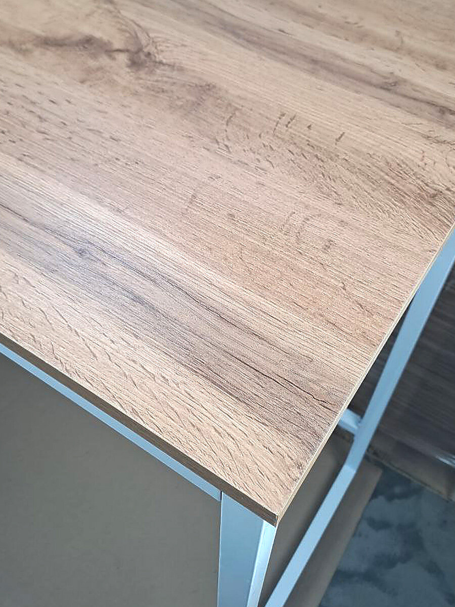 Прямоугольная деревянная столешница изготовлена из ламинированного ДСП в коричневом цвете «Дуб вотан». Это покрытие делает изделие долговечным и не требует особого ухода. Ножки оснащены специальными заглушками, которые предотвращают появление царапин на полу, а так же регулировкой по высоте.