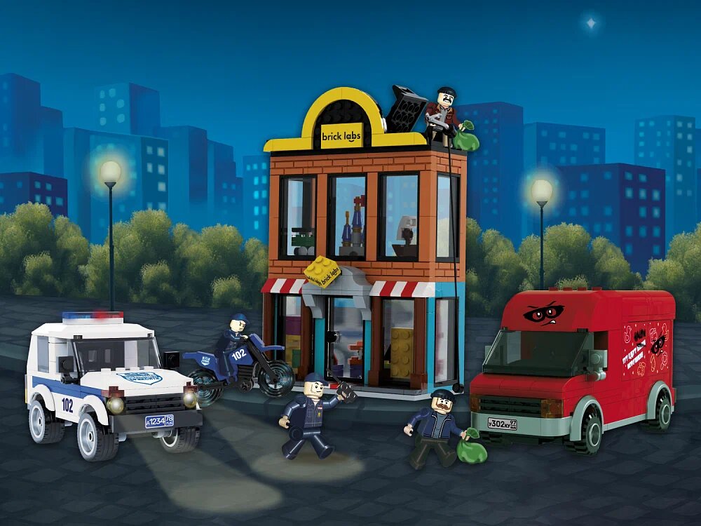 Конструктор Brick Labs «Ограбление магазина конструкторов» — это яркий динамичный игровой набор, который переносит ребёнка в центр настоящего криминального приключения. Набор позволяет развернуть целую сюжетную историю: хитрые злоумышленники пытаются ограбить магазин, а смелые полицейские стремятся им помешать. Детей ждут продуманные сцены, подвижные элементы, мини-фигурки героев и множество аксессуаров, которые существенно расширяют возможности игры. В комплект входит здание магазина с детализацией интерьера, витринами и кассовой зоной, а также транспорт преступников и элементы, позволяющие инсценировать момент взлома. Полицейский наряд оснащён служебным автомобилем и всем необходимым для задержания нарушителей. Набор способствует развитию фантазии, логики и навыков сюжетно-ролевой игры. Детали плотно сцепляются, удобно лежат в руках и совместимы с элементами других популярных конструкторов, что позволяет расширять сюжет и комбинировать наборы между собой.