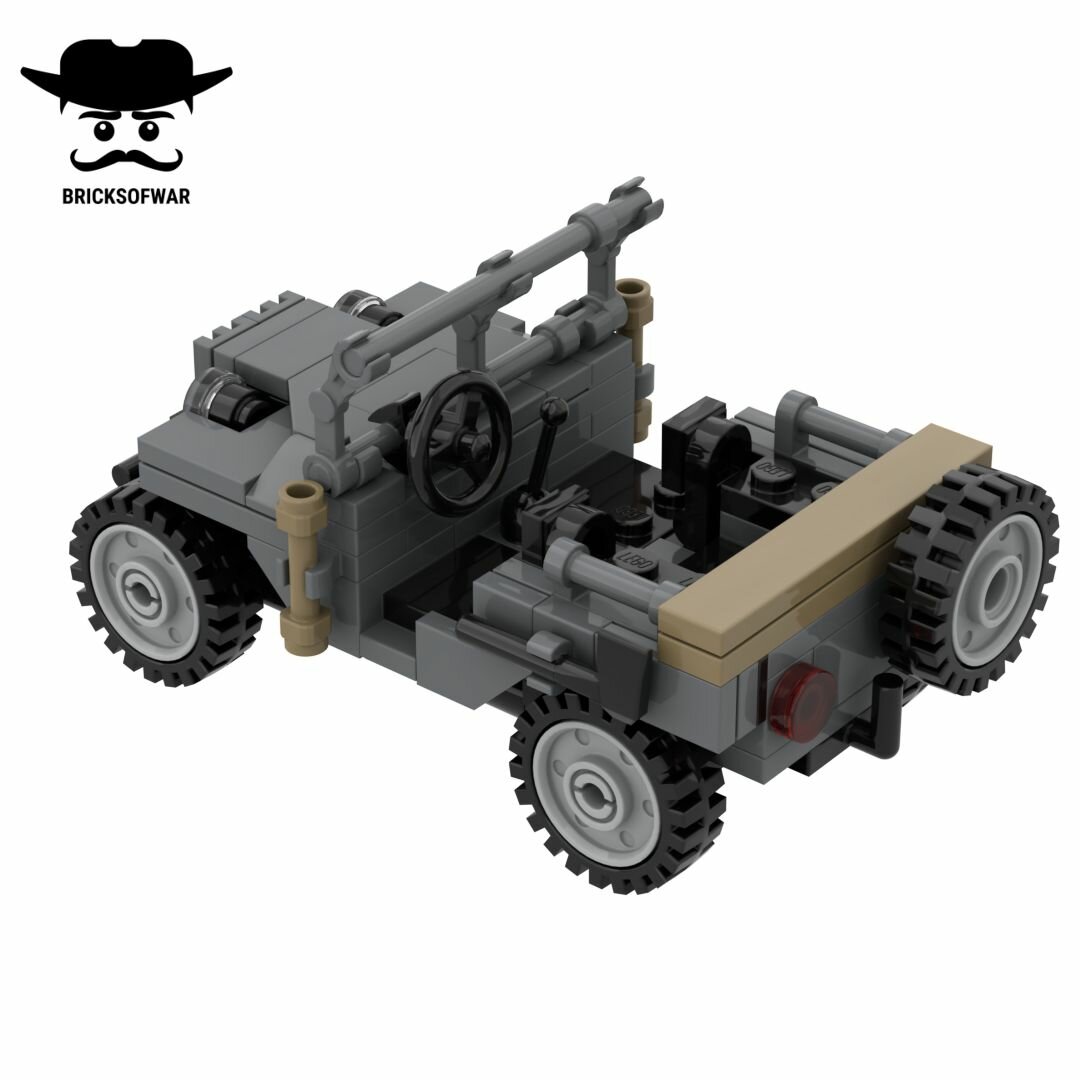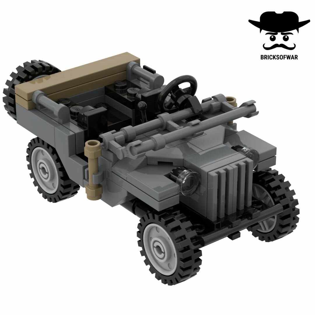 Приветствуем! Мы команда Bricks of War, занимаемся созданием наборов военной тематики из деталей датского производителя. Представляем Вашему вниманию советский внедорожник ГАЗ-64. В кузов поместится три фигурки (две спереди и одна сзади) или два солдата и груз в задней части автомобиля. Сзади есть крюк, за который можно прицепить орудие или прицеп для буксировки. Набор упакован в фирменную коробку, так что можно смело брать для подарка. Внутри коробки - цветная распечатанная инструкция. ГАЗ-64 считается командирским автомобилем, но его также использовали как медицинскую, разведывательную и транспортную машину. ГАЗ-64 - настоящая легенда Великой Отечественной войны. Он был надежен и прост в производстве, поэтому использовался и после окончания Второй мировой войны. Сам маршал Красной Армии Георгий Жуков ездил на таком.
