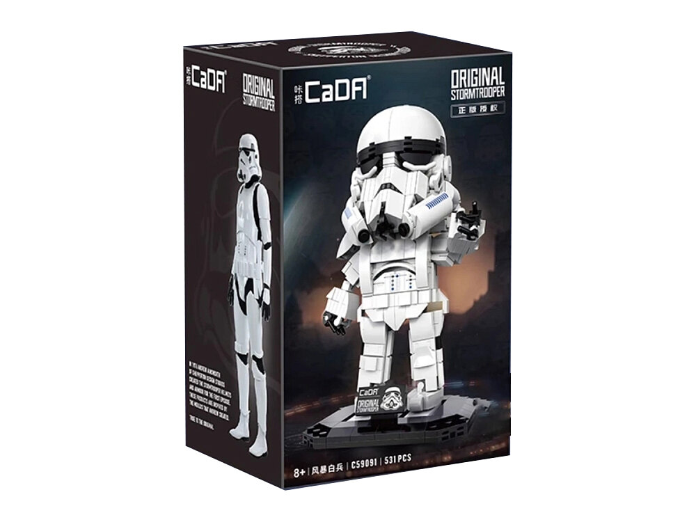 Конструктор CaDa «Штурмовик» (C59091W) — детализированная сборная фигурка бойца из фильма «„Звездные войны“» в фирменной броне. Набор состоит из 531 детали, а готовая модель достигает размеров 23,8 см в высоту, 15,3 см в длину и 11,9 см в ширину. Конструкция включает подвижные элементы рук и кистей, проработанный шлем и сегментированные элементы защиты. Фигурка установлена на подставке, что позволяет удобно использовать ее для коллекционной экспозиции.