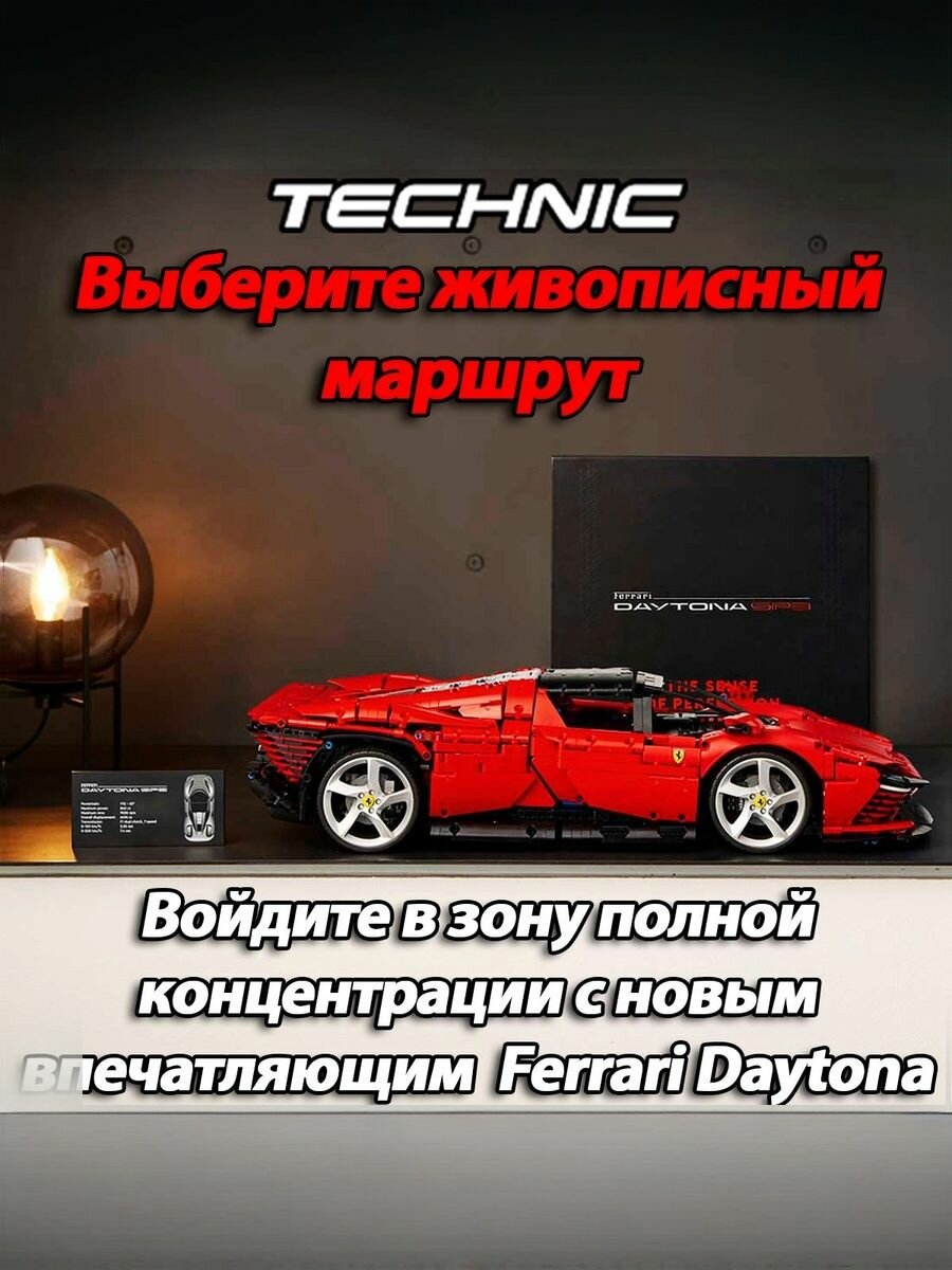 В серии Техник появилась впечатляющая модель для взрослых поклонников Ferrari. Войдите в зону полной концентрации, воссоздавая черты модели Ferrari Daytona SP3 в классическом красном цвете с хромированными дисками. Затем поместите ее в зону показа, чтобы полюбоваться культовой задней частью и изогнутыми линиями, которые делают эту модель в масштабе 1:8 такой особенной.