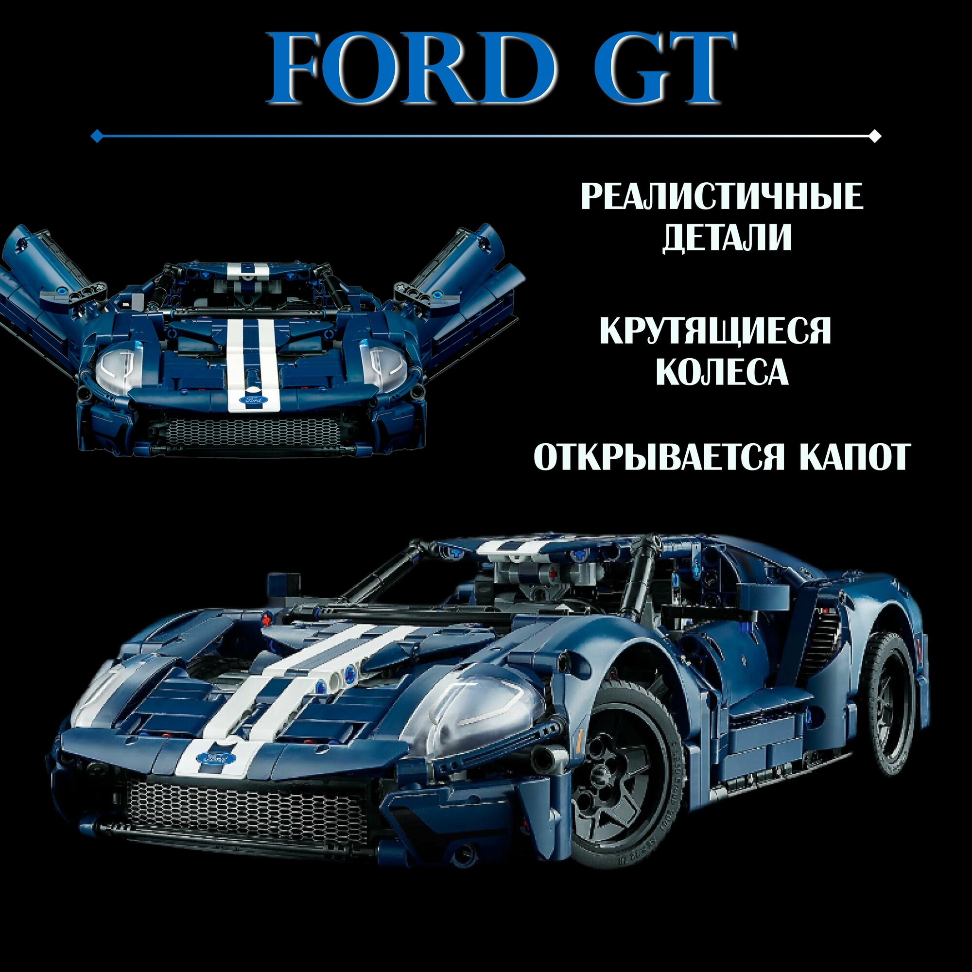 В наборе находятся детали для создания копии известного автомобиля. Транспортное средство, собранное из деталей совместимых с конструкторами известных брендов. В этом наборе с моделью Ford GT есть детали, вдохновленные настоящим автомобилем, такие как двигатель V6 с подвижными поршнями, независимая подвеска всех колес и рулевое управление передней оси. Сборка данного конструктора позволит развить свое творческое мышление, моторику рук и усидчивость. Подходит как для детей, так и для взрослых.
