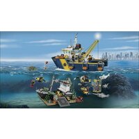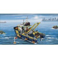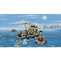 Вам предстоит собрать мощное судно, на котором аквалангисты отправятся исследовать океаническое дно. Но будьте крайне осторожны, ведь помимо безобидных осьминогов, здесь обитают хищные акулы, жаждущие добычи. Именно поэтому лучше обезопасить аквалангистов и при погружении воспользоваться специальной металлической клеткой. Опустившись вместе с ними на дно, вы сможете не только исследовать давно затонувший корабль, но и, возможно, найти ценные сокровища. На крыше судна установлены осветительная система (сигнальные огни и прожекторы), датчики, спутниковые антенны. В носовой части корабля зафиксирована спасательная моторная шлюпка. На палубе предусмотрено место для плавательного оборудования. Судно оборудовано тросовой лебедкой, опирающейся на наклоненную раму. Длину троса можно регулировать при помощи специальных рычагов. Подводный батискаф имеет два подвижных механических манипулятора, при помощи которых можно подхватывать и доставать обломки затонувшего судна. Мини-подлодка оснащена пультом дистанционного управления. В комплекте: 7 минифигурок (4 аквалангиста, 2 моряка, капитан корабля). Аксессуары: акулы, осьминог, водоросли, рыба-пила.
