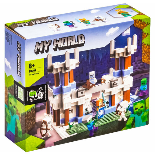 Конструктор «The Ice Castle Minecraft» из 499 деталей в собранном виде имеет размер 23*19*16 см. Ледяной дворец имеет две сторожевые башни для наблюдения и пусковую установку огненных стрел для отражения атак, а внутри спрятан классический стол для крафта, сундук с припасами и горшок для зелий. Персонажи минифигурок: Королевский Воин с алмазным мечом, Йети с большим луком, 2 зомби с топорами, 2 скелета с луками.