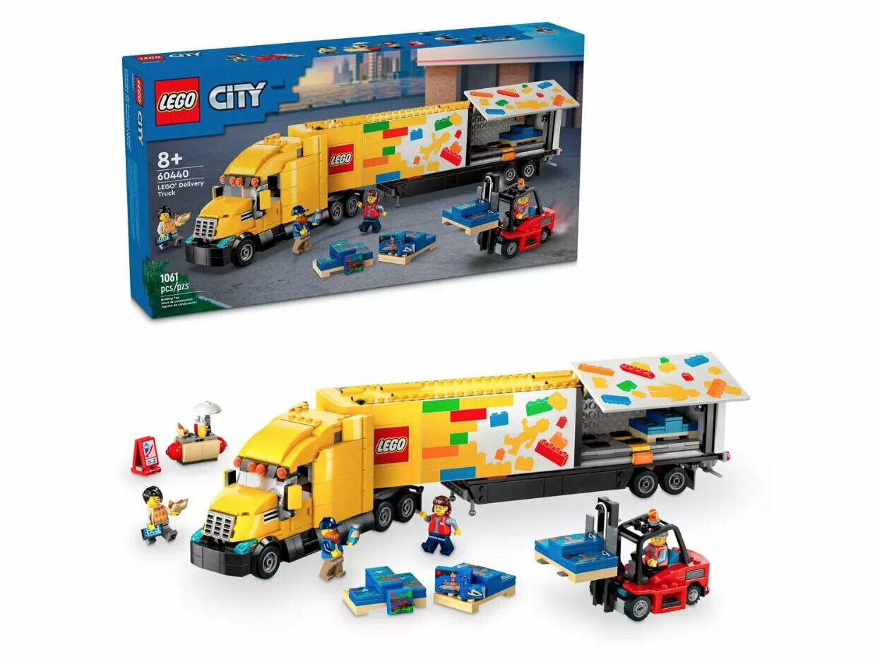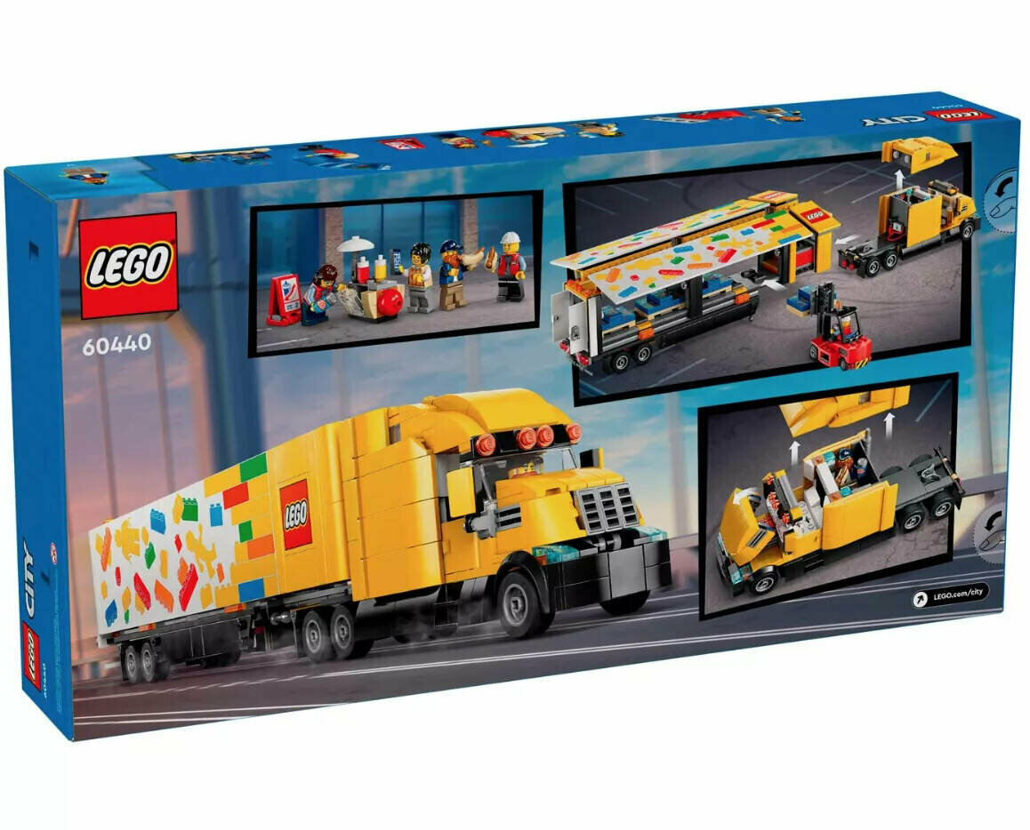 Набор LEGO 60440 Грузовик доставки из серии City Traffic, выпущенный в 2024 году, содержит 1061 деталь и 4 минифигурки. Он позволяет собрать желтый грузовик дальнего следования со спальной кабиной и большим прицепом, а также работающий погрузчик, п
