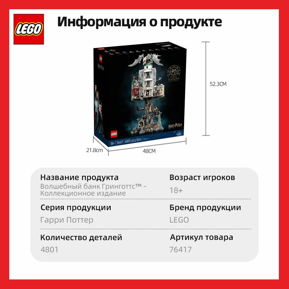 Перенеситесь в волшебный мир, собирая этот набор LEGO 76417 Harry Potter Gringotts Bank коллекционное издание. Воссоздайте роскошное фойе банка и мезонин с сейфом в стене для хранения секретного письма Хагрида. Постройте спиралевидную дорожку для тележкохранилища с механизмом, который останавливает тележку в каждом из 3 подземных хранилищ, включая хранилище Беллатрикс, внутри которого находится волшебный сюрприз! В набор также входит фигурка железнобрюхого дракона и сборная модель магазина "Волшебный зверинец". Сборка и демонстрацияИнструкции в коробке и в приложении LEGO Builder помогут вам в увлекательном творческом процессе. Сложите модели хранилища, банка и дракона и добавьте 13 минифигурок LEGO, входящих в комплект, чтобы создать потрясающий центральный элемент.