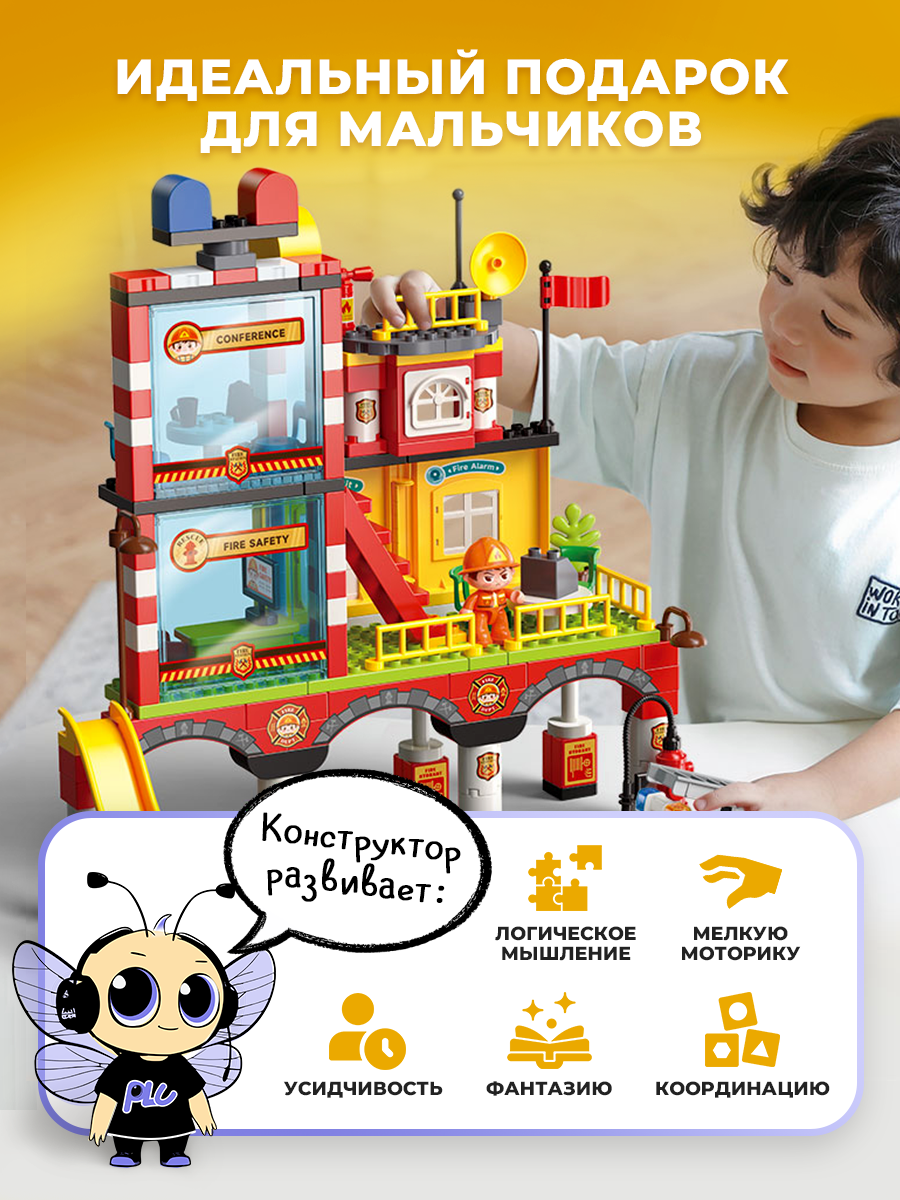 Этот потрясающий 3д конструктор с большими деталями позволит вашему ребенку построить настоящую пожарную станцию. Игрушка включает в себя множество лего деталей, которые создают увлекательный игровой процесс для мальчиков и девочек. Фигурки лего френдс помогут оживить сцены с пожарными машинами и заданиями по спасению. Развивающий конструктор подходит детям в возрасте от 2 лет, развивает их воображение и мелкую моторику. Являются отличным подарком на день рождение или новы год. В большом наборе лего, есть фигурки lego friends — это прекрасный вариант новогоднего подарка для детей или подарок мальчику, девочке в день рождения. Он входит в серию игры для детей lego city дупло, знакомящую ребенка с жизнью города. Малыши смогут научиться координировать свои действия, комбинировать части и логически мыслить, что делает набор отличной развивающей игрушкой. Пожарная станция - это не только развлечения, но и образовательная часть игры которая относится к развивающим игрушкам или как их называют развивашкам, они объясняют важность профессии пожарного. 3D Детский конструктор крупный идеально подходит как для одиночной игры, так и для коллективных занятий с друзьями или родителями. В наших карточках Вы сможете найти и другие варианты 3 д конструктора: маленькое мини лого дом с обзорным колесом, замок лего с лабиринтом и минифигурками, lego classic duplo.