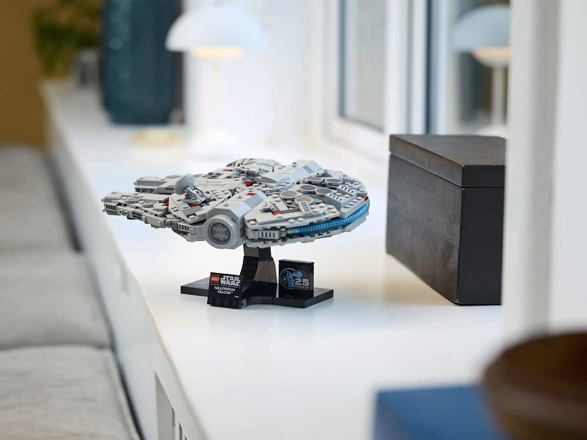 LEGO Star Wars Сокол тысячелетия, выполненный в уменьшенном масштабе. Модель установлена на специальной подставке с табличкой и логотипом LEGO Star Wars, а также символикой, отмечающей 25 лет этой культовой серии.