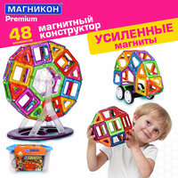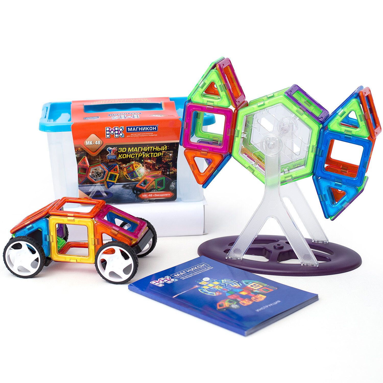 Магнитный конструктор Магникон - это уникальная развивающая игрушка, которая не оставит равнодушным ни одного ребенка, это конструктор для малышей, конструктор для мальчиков, конструктор для девочек. Конструктор для детей 2 лет, 3 лет, 4 лет, 5 лет, 6 лет Магникон подходит для обучающих игр в поездке и отпуске. Детские игрушки Магникон отличается от привычных конструкторов тем, что его детали легко соединяются между собой силой магнитного притяжения. Конструктор для самых маленьких деток состоит из пластиковых деталей различных геометрических форм и встроенных в них магнитов. Магниты, в свою очередь, свободно вращаются внутри пластика и поворачиваются друг к другу нужным полюсом, поэтому всегда притягиваются. Есть одна особенность, которая недоступна другим конструкторам – это то, что все элементы соединяются друг с другом под разным углом, что позволяет создавать уникальные потрясающие конструкции.