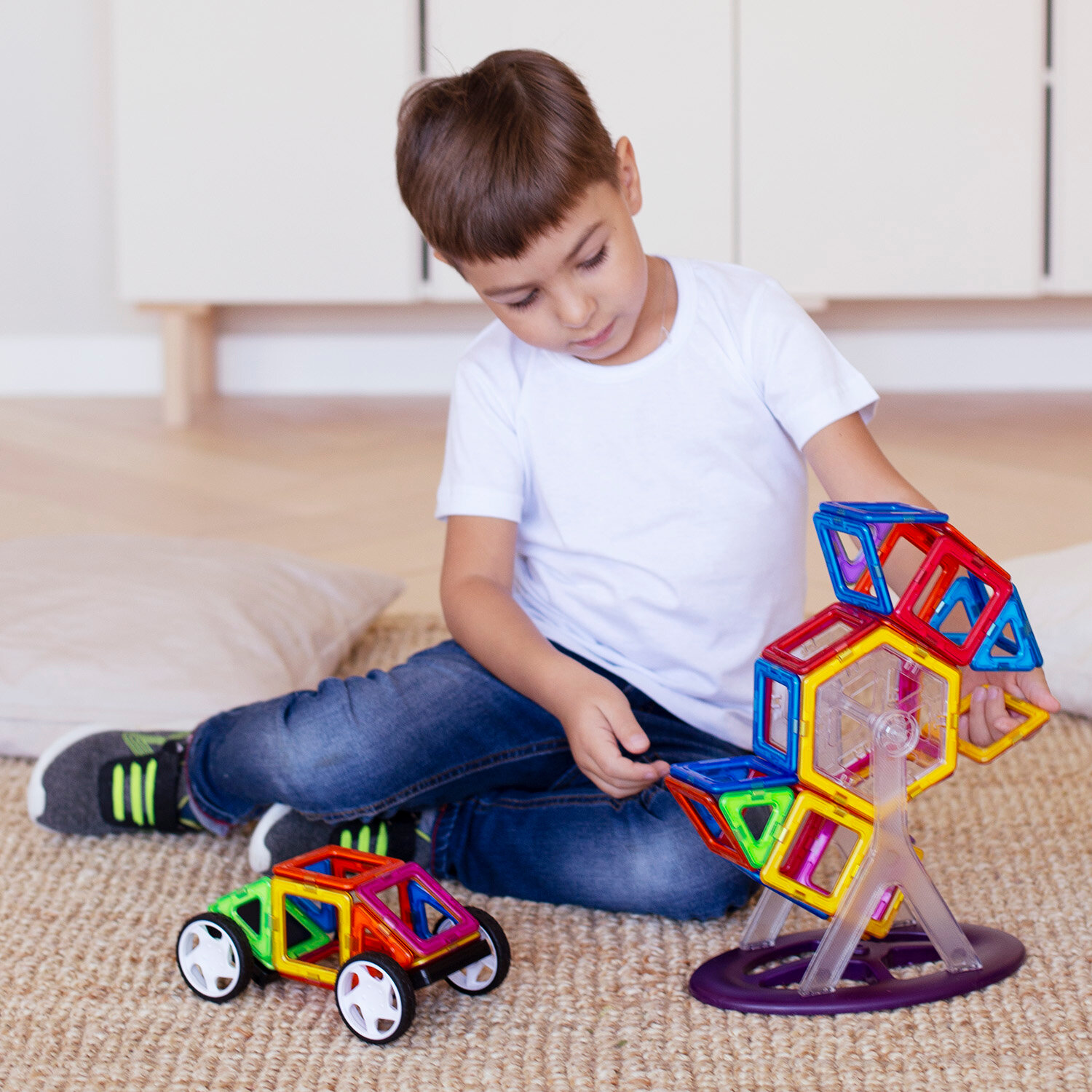 В процессе конструирования малыш воочию изучает свойства магнита, математику, развивает мелкую моторику, строительные навыки, пространственное мышление, логику и интеллект. Только у детского конструктора Магникон детали с усиленными магнитами, из которых можно строить крепкие большие постройки, брать их в руки и играть ими. Развивающий конструктор займет ребенка надолго, на час или даже на целый день. В конструктор МК Магникон интересно играть как одному, так и вместе со всей семьей. Поэтому Магникон покупают не только домой, но и в учебные и развивающие центры, в детские сады и школы в качестве развивающей игры. Конструктор сделан так, что магниты надежно запаяны внутри деталей. Магнитные детали достаточно большие, у них нет острых углов, детали сделаны из сверхпрочного пластика, их сложно сломать. Поэтому игрушка безопасна для ребенка. С помощью пластикового конструктора для малышей можно создавать различные модели и магнитные фигуры, такие как игрушки для малышей и игрушки для детей ракета, кукольный домик, динозавр, карусель, машинка для мальчика 2 лет, 3 лет, 4 лет, 5 лет, 6 лет или робот, колесо обозрения, замок принцессы, рыбка. Магнитный 3d конструктор - это игрушка для мальчиков и игрушка для девочек, развивающая игра для дома и в детском саду. Магнитные детали разноцветные их можно раскладывать по цветам и использовать как сортер. Конструктор с магнитами может использоваться в качестве бизиборда, который занимает ребенка на длительное время, развивая его умственные способности. Игровой набор Магникон подходит для самостоятельного игрового процесса, а также для совместной игры с друзьями или родителями. Магнитный 3Д конструктор - отличный выбор конструктора для малышей, которые только начинают знакомиться с миром конструирования и развивающих игрушек. Он поможет ребенку развить воображение, творческие способности и логическое мышление. Конструктор с магнитами подходит для подарка ребенку на День рождения, Новый год, 8 марта или 23 февраля. Наша компания является производителем бренда Магникон, поэтому мы предлагаем игрушки для детей по низким ценам. У Магникон есть простые конструкторы с небольшим количеством деталей, а также большие игровые наборы на любой вкус.