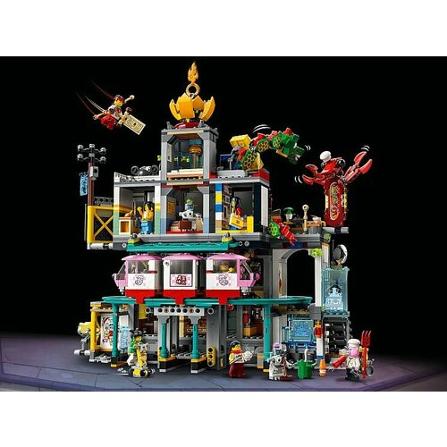 Здесь так много интересного! Семь минифигурок оживляют город — Манки Кид в костюме туриста, мистер Танг, Мэй, Пигси, Хан, Хуанг и машинист поезда, а также собираемые роботы Citybot A05 и Citybot A16 и множество аксессуаров. Множество интересного — магазин игрушек , отель «Лотос», магазин панды Спиди, два ресторана, караоке-кабинка K-TV, кафе для любителей чая с пузырьками, трасса монорельса с поездом в честь Пигси, а также съёмное Огненное кольцо. Легко перестраивается — каждое здание можно легко отсоединить и перестроить город. В набор также входит сборный воздушный шар и переносная кухня для Пигси, чтобы расширить возможности игры. Размеры города составляют более 38 см в высоту, 43 см в ширину, и 23 см в глубину.
