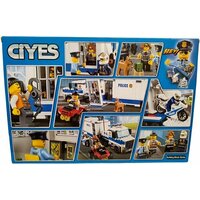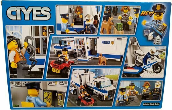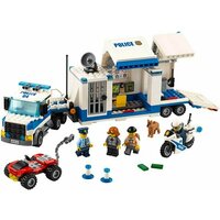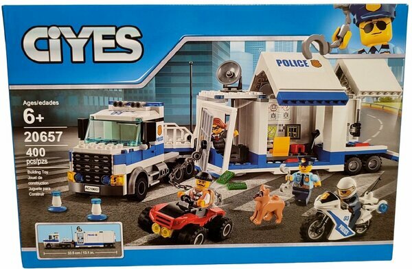 Из деталей набора Вы сможете собрать подробную модель командного центра городской полиции. Его основой служит длинный тягач, разделённый на две части. Спереди видна массивная кабина, оборудованная голубоватым ветровым стеклом, снимающейся крышей, сигнальными огнями, боковыми зеркалами и усиленным капотом.