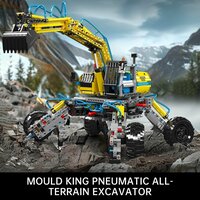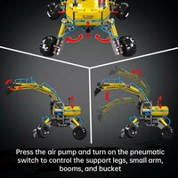 Конструктор «Пневматический экскаватор-вездеход RC» от производителя Mould King полностью совместим с Лего. Радиоуправляемая модель экскаватора для экстремальных условий работы имеет очень необычное гусеничное шасси: четыре независимых трака могут принимать как горизонтальное, так и ломаное треугольное положение. Ковш крепиться на рычажную стрелу, которая приводится в движение двумя поршнями, и все это великолепие моторизировано и дополнено пневматическими механизмами, а управлять машиной можно с пульта или APP-приложения. Серия Техник является одной из самых популярных и узнаваемых серий конструкторов Лего. Наборы серии представляет собой уникальную комбинацию традиционного конструктора и механических деталей, которые позволяют создавать функциональные модели с различными механизмами и электрическими моторами. Конструкторы Technic предназначены для более старших детей и подростков, которые уже имеют опыт в сборке конструкторов. В серии Техника представлены модели различных транспортных средств, таких как легковые машины, спортивные автомобили, грузовики и самосвалы, самолеты, вертолеты, мотоциклы (БМВ, Дукати, Ямаха, Сузуки), строительная техника (бульдозеры, экскаваторы, подъемные краны, лесовозы, трактора), грузовые эвакуаторы, погрузчики и роботы. Одной из отличительных особенностей Technical является наличие функциональных элементов, таких как двигатели с подвижными цилиндрами, коробки передач с шестеренками, пневматические механизмы и амортизаторы, редукторы которые позволяют моделям двигаться, поднимать грузы и выполнять различные действия. Благодаря этим механизмам, каждый конструктор становится полноценной рабочей моделью. Модели из серии Technique на пульте управления с инфракрасными датчиками разработаны с учетом принципов инженерии и механики, что позволяет детям не только строить их, но и понимать, как они функционируют. Среди детей и взрослых очень популярны болиды формулы 1 и мощные спортивные автомобили серии Техник такие как: Бугатти (Bugatti Chiron), Ламборджини (Ламборгини Urus и Lamborghini Sian), Порше (Porsche 911), Феррари (Ferrari Daytona), Макларен (McLaren Senna GTR), Шевроле (Chevrolet Камаро), Додж (Dodge Челленджер), Ford (Форд Мустанг), Мерседес (Mercedes-Benz AMG GT), а также джипы на полном приводе: Ленд Ровер (Land Rover Дефендер), Джип (Jeep Вранглер). В наборах включены подробные инструкции, которые помогут собрать модели шаг за шагом. Конструкторы серии Техник не только развивают логическое мышление и моторику рук у детей, но и позволяют им узнать больше о механизмах и принципах их работы. В процессе сборки моделей, дети могут изучать различные механики и их функции, что способствует развитию их технического мышления. Модели линейки станут отличным дополнением к другим сериям, например, строительная техника с Сити (City). Конструкторы - это увлекательная игра, чтобы детям весело проводить время и развивать свои навыки сборки. Это отличный подарок для мальчиков и для девочек разного возраста. Конструкторы серии Technic подходят для детей, начиная от 6 лет. Наборы помогают развивать мелкую моторику, абстрактное и логическое мышление. Дети учатся собирать детали по инструкции или по своему воображению, что способствует развитию творческого мышления. Они могут использоваться в сочетании с видеоиграми или мультиками, что делает процесс сборки еще более интересным