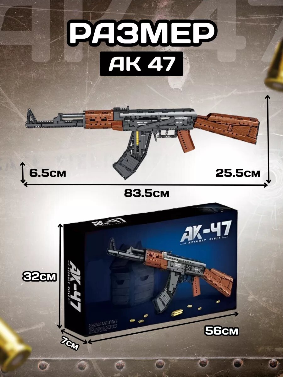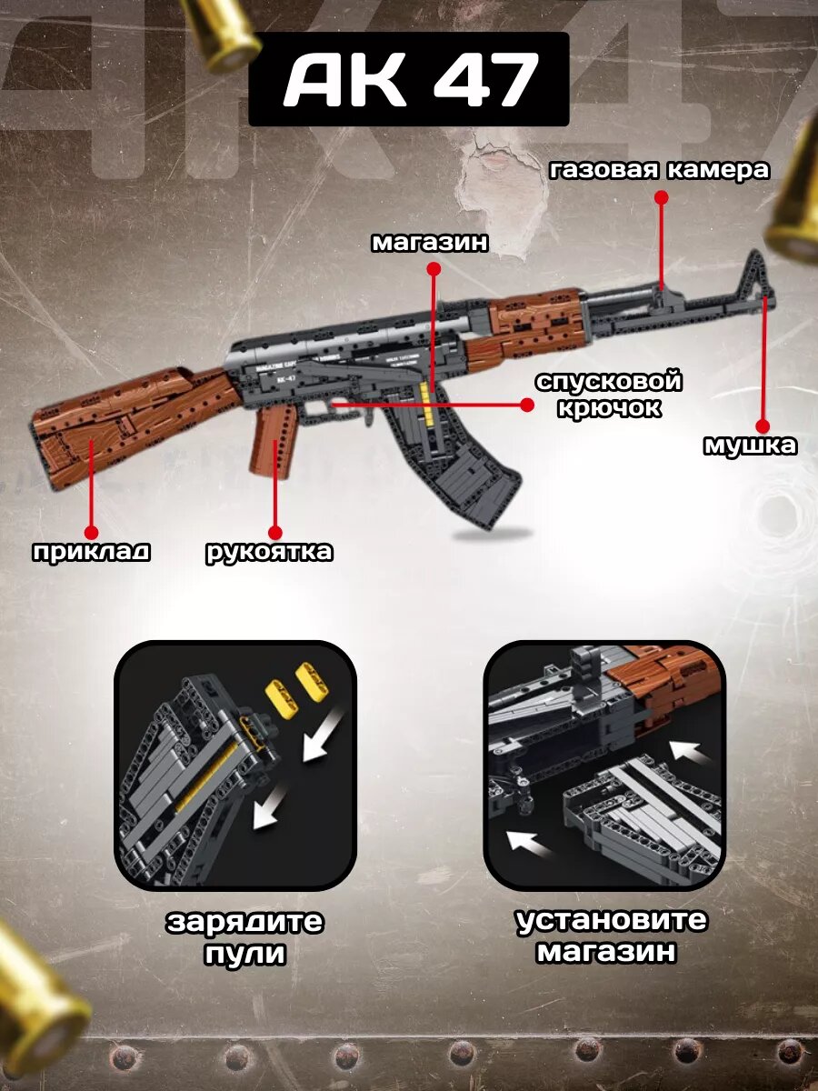 Модель выглядит как Автомат AK47, Игровой пластиковый подарочный набор хороший подарок для мальчиков и девочек, увлекательное занятие игра на внимательность для детей. Автомат AK47 в виде конструктора! Серия конструкторов Lеgo Technical оружие одна из немногих, которая не представлена в оригинале. В линейке можно найти детское оружие с мягкими пульками, конструкторы-автоматы, классические снайперские винтовки с пулями, штурмовые винтовки, пистолеты и много разнообразного игрушечного оружия. Приобретая конструкторы оружие, не переживайте о безопасности, ведь они обладают недостаточной для нанесения травм дульной энергией, либо стреляют мягкими патронами. Множество разного оружия можно наблюдать в компьютерных играх, одними из самых популярных игр являются стрелялки POINT BLANK, Пабг (Пубг / Pubg), VALORANT, КС ГО (CS GO), Вар Фейс (Warface) и WARFACE. Перенесите любимый калаш или снайперку или дигл ребенка с картинок на экране - в динамичную подвижную игру. Мы уверены, что игра с собранной конструкцией - точно не даст заскучать, будь то обычное детское ружье с пульками или конструктор - снайперская детская винтовка. Лeго оружие достаточно разносторонняя и находит отклик у детей и взрослых от внешнего вида до подробных элементов. Кроме того, конструктор является еще и полезной игрушкой, потому что требует от малыша внимание, сосредоточенность и аккуратность. Аналоги Lеgo выпускаются далеко не в первый год, и уже давно по качеству догнали оригинал. Не переживайте за качество аналогов – они давно не отличаются от оригинала датской фирмы, и производители не первые десятки лет работают, чтобы ребенок мог развивать мелкую моторику не боясь пораниться. Детали всегда четкие и крепкие, и ассортимент часто шире, чем сам Лeго. Набор конструкторов точно будет прекрасным подарком как мальчику, так и девочке, потому что любой ребенок, взрослый имеют любимый мультик. Будь это Новый Год, День Рождения, 8 Марта или 23 Февраля - конструктор будет подходить на любой случай.