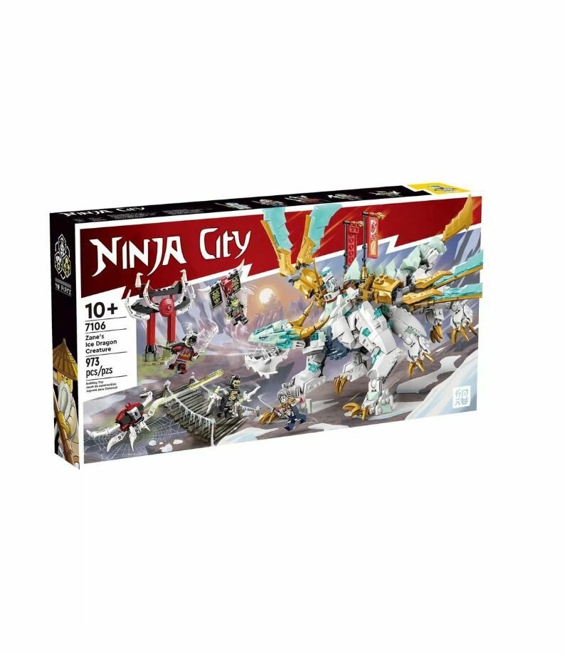 Ниндзяго Ninjago "Ледяной дракон Зейна". Эта модель 2 в 1 может быть построена в виде подвижного ледяного дракона с 6 ногами, длинным хвостом, рогами и крыльями с золотыми лезвиями, а затем перестроена в подвижного воина-дракона, стоящего на двух ногах и держащего большой золотой клинок. В комплект входят 5 минифигурок: Зейн, Пиксал и каждый с мечом, чтобы разыграть бои против злодеев Костяного рыцаря, Костяного воина и Костяного короля, у каждого из которых есть оружие из набора оружия зеленых костяных воинов. У этой злодейской троицы также есть храм, построенный из кирпичиков, вокруг которого они могут собираться. Конструктор ниндзяго превращает развитие детей в увлекательное занятие.