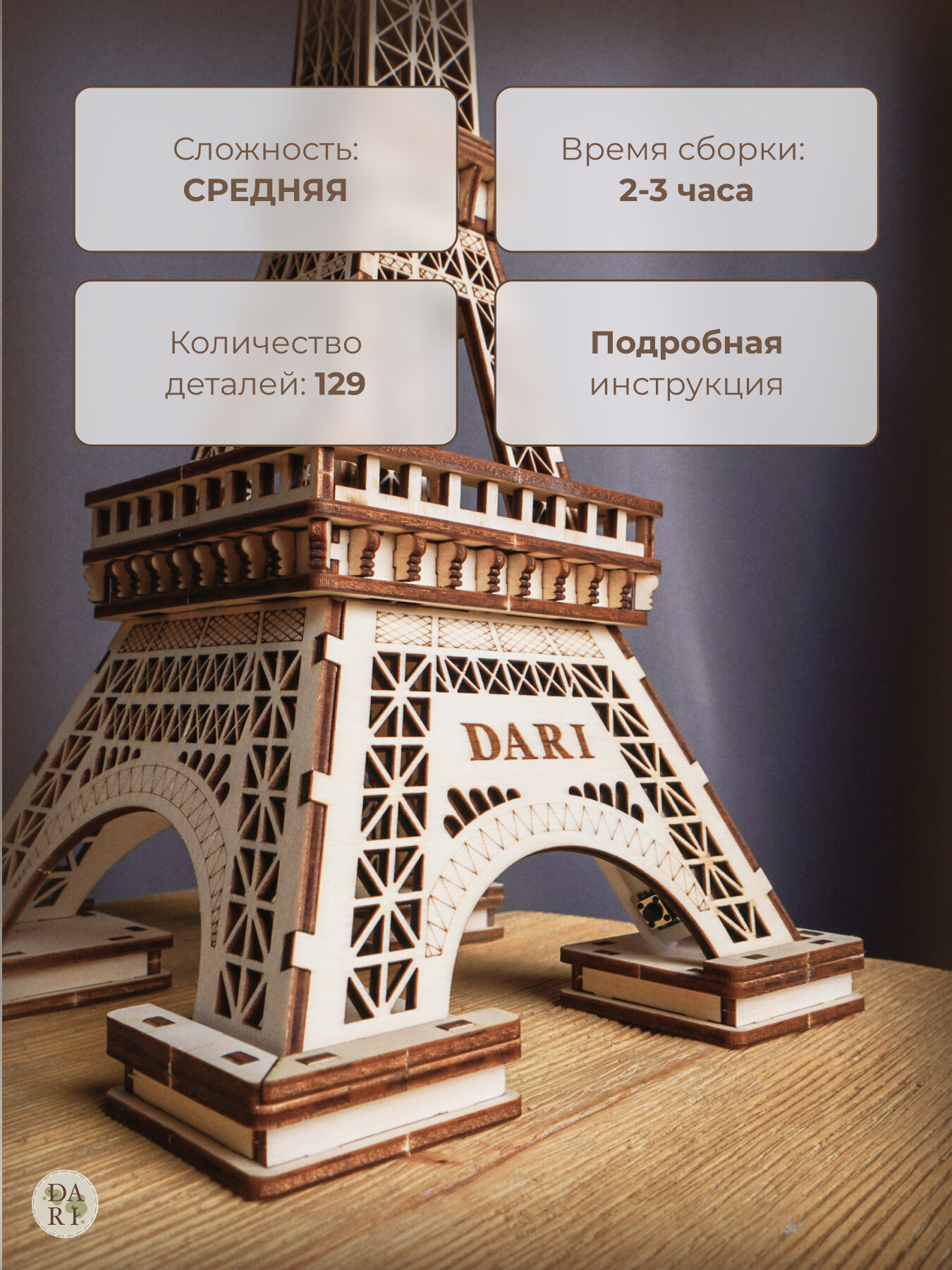 Представляем наш деревянный 3D конструктор и от бренда Dariwood в виде сборной модели Эйфелевой башни с подсветкой - это уникальный подарок, который порадует как взрослых, так и детей! Набор для создания детализированной копии станет настоящей находкой для любителей творчества и моделирования. Сборка изделия происходит легко и не требует клея. Можно использовать как стильный настольный ночник, светильник или декор для интерьера дома. Она произведена в России из экологичных натуральных материалов - древесины высокого качества, обладающей насыщенным природным ароматом. Элементы имеют гладкую поверхность и просто соединяются. Красивая форма декорации понравится всем. Процесс установки увлекательный и полезный: он развивает моторику, творческое мышление, усидчивость и концентрацию. Комплект включает батарейки, благодаря которым он будет украшением для любой комнаты - будь то детская, спальня или гостиная. Оригинальная игрушка с крупными и мелкими деталями, а также светящейся гирляндой создаст в помещении уют и особую атмосферу. Это развлечение и способ тренировать память, подходящее детям! 3д конструктор для мальчиков и парней - интересный и универсальный презент Отличный сюрприз на день рождения мужчине или без повода. Конструктор поставляется в прочной подарочной упаковке. Соберите макет руками или вручите большую радость и незабываемые моменты игры любимому сыну подростку или дочке, мужу, брату, другу или подруге с нашей коллекцией!