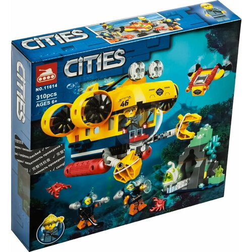 Конструктор "Океан: Исследовательская подводная лодка" 11614 предлагает собрать желтую подводную лодку со съемной крышей, руками-манипуляторами, прожекторами и мощными двигателями. В комплекте также идут глубоководный дрон и подводная пещера, покрытая кораллами.