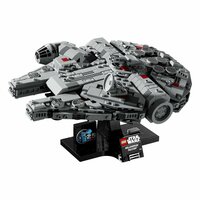 Создан для демонстрации. На сборной подставке есть фирменная табличка и кубик LEGO Star Wars, посвященный 25-летию LEGO Star Wars. Он предназначен для демонстрации «Тысячелетнего сокола» под динамическим углом.