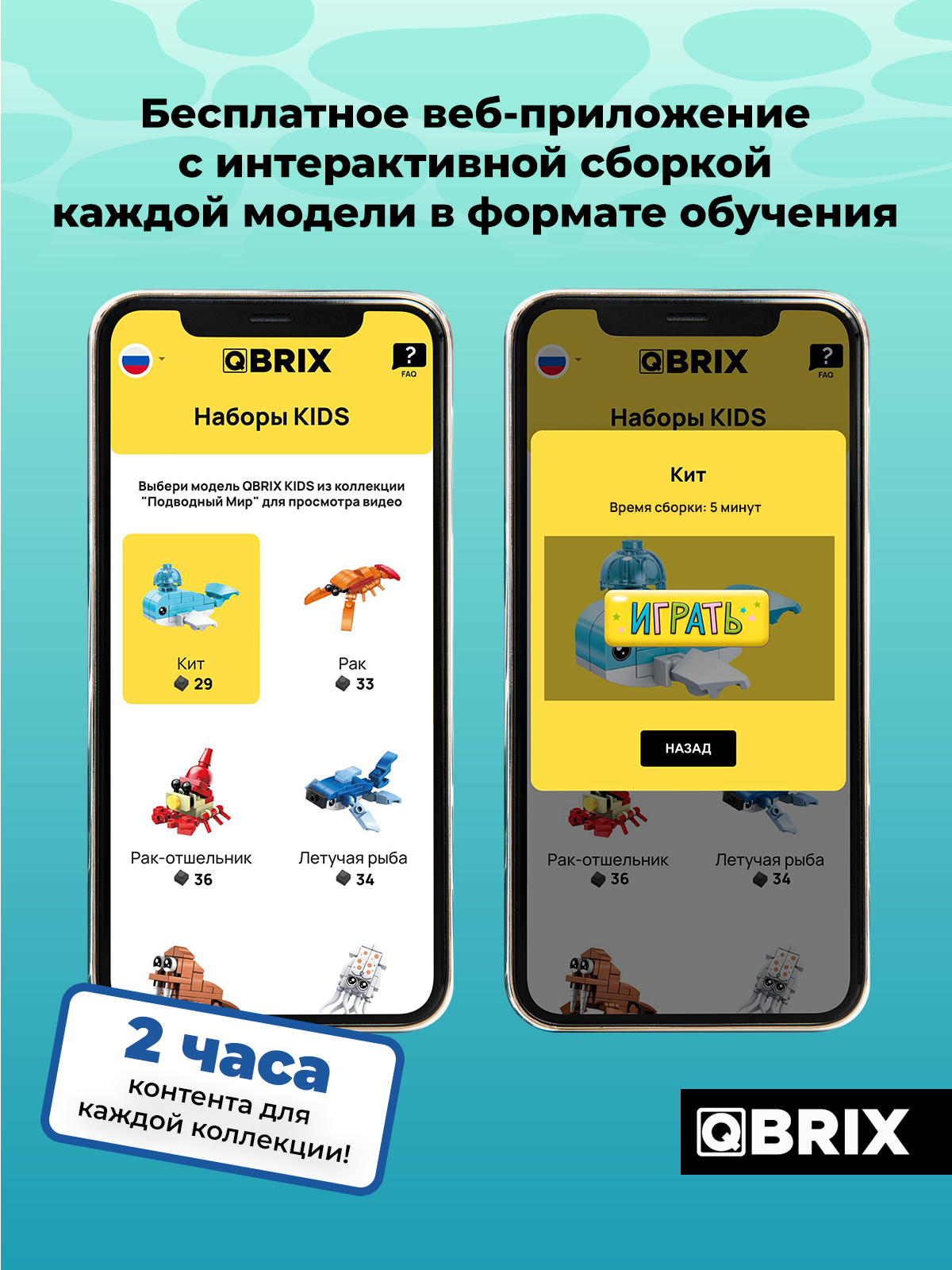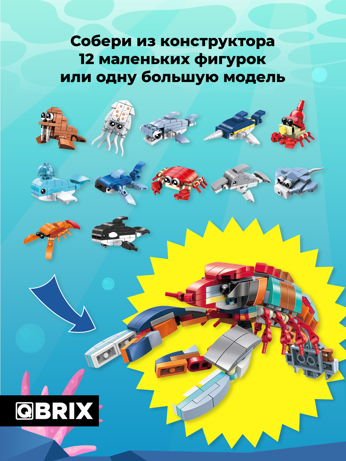 Представляем новинку от QBRIX! QBRIX KIDS – серия ярких детских конструкторов о мире животных. В каждом наборе тебя ждут представители подводного мира, которых ты можешь собрать с помощью понятной видеоинструкции с интересными фактами о каждом из них. У тебя получится 12 маленьких фигурок или одна большая!