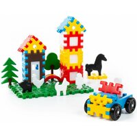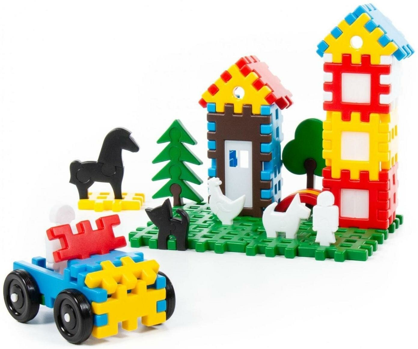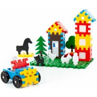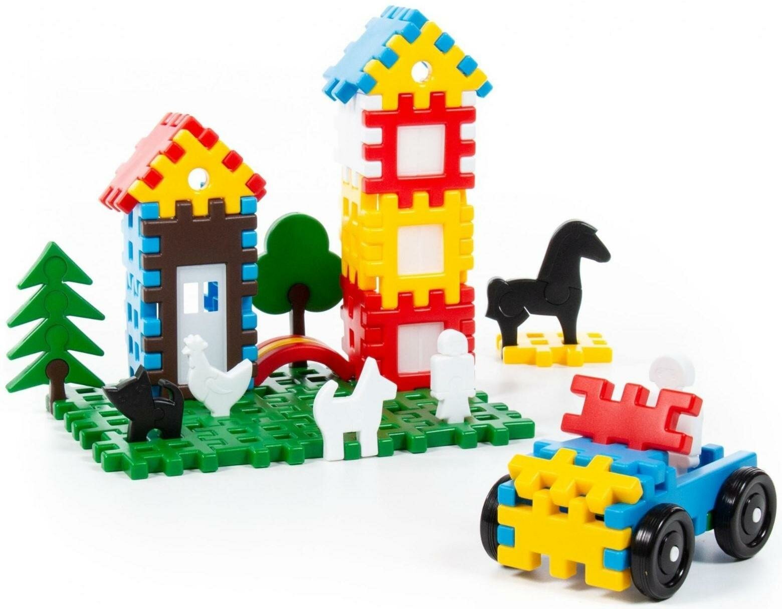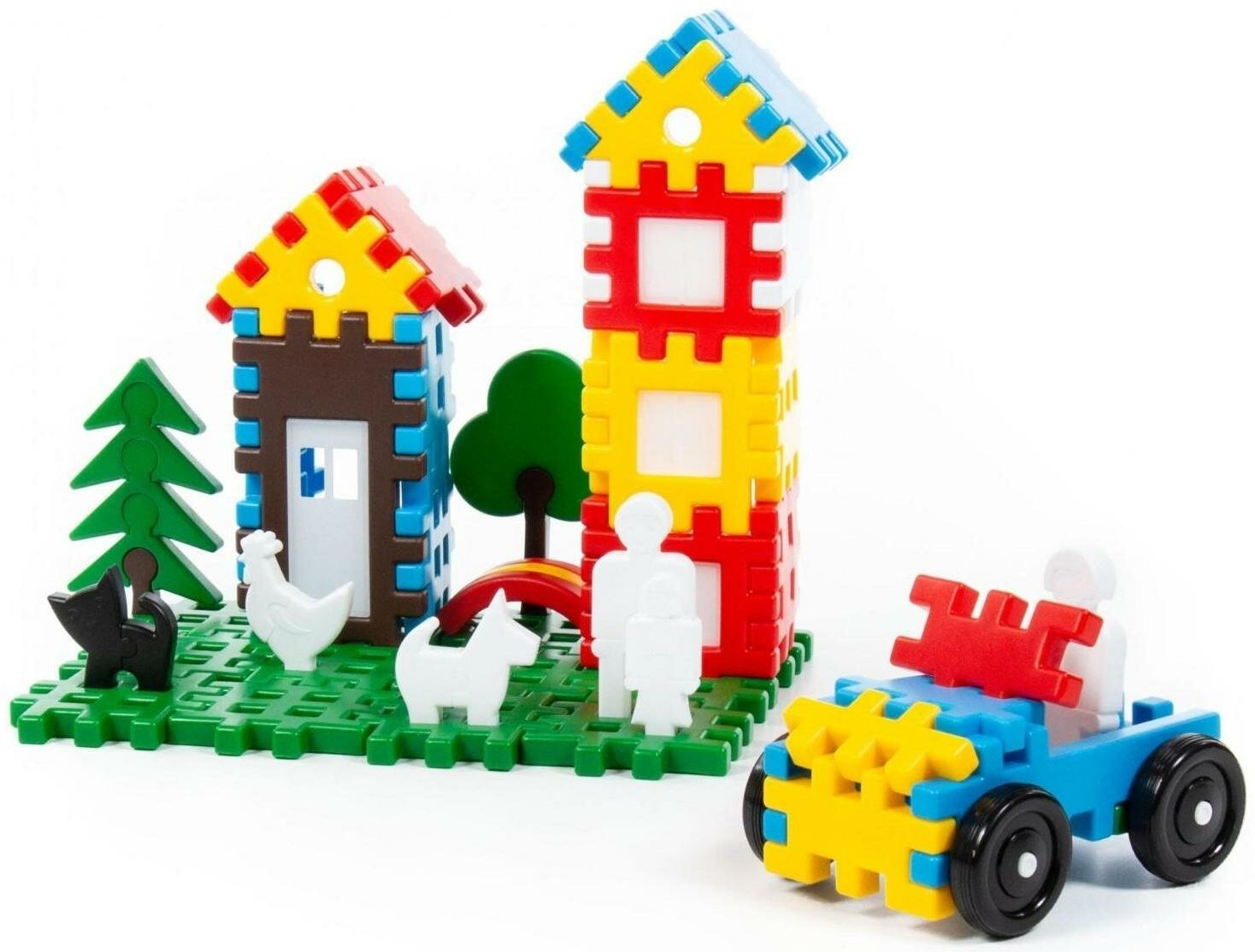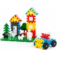 Крупные элементы в виде забора и решётки, а также фигурки людей, животных и деревьев, которые собираются по принципу пазла, удобно держать детским ручкам и легко соединяются между собой. Это позволяет малышам собирать машинки, дома и другие сооружения, а также заселять их жителями и засаживать участок деревьями.