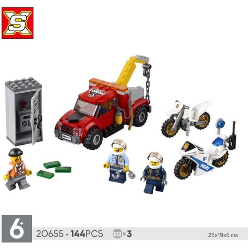 Грабители в наборах Cities не перестают удивлять своей находчивостью и изобретательностью, конструктор 10655 (20655) Побег на буксировщике не исключение. На этот раз преступники раздобыли машину буксировщик с небольшим краном. Добравшись до сейфа с помощью газового резака и монтировки, они зацепили его краном и бросились наутёк. Полиция устроила погоню на мотоциклах. Невероятный простор для сюжетов игры при всего 144 деталях. Набор содержит автомобиль буксировщик грабителя с мелкими аксессуарами, сейф, два полицейских мотоцикла и, конечно, же фигурки двух полицейских и грабителя. Удивительная серия конструкторов Cities, пожалуй, одна из самых разнообразных и широких. Немало внимания в наборах уделяется различным службам экстренного реагирования и специфическим исследованиям. Конструкторы Ситис позволят ребенку построить город своей мечты, который станет безграничным простором для фантазии и воображения.