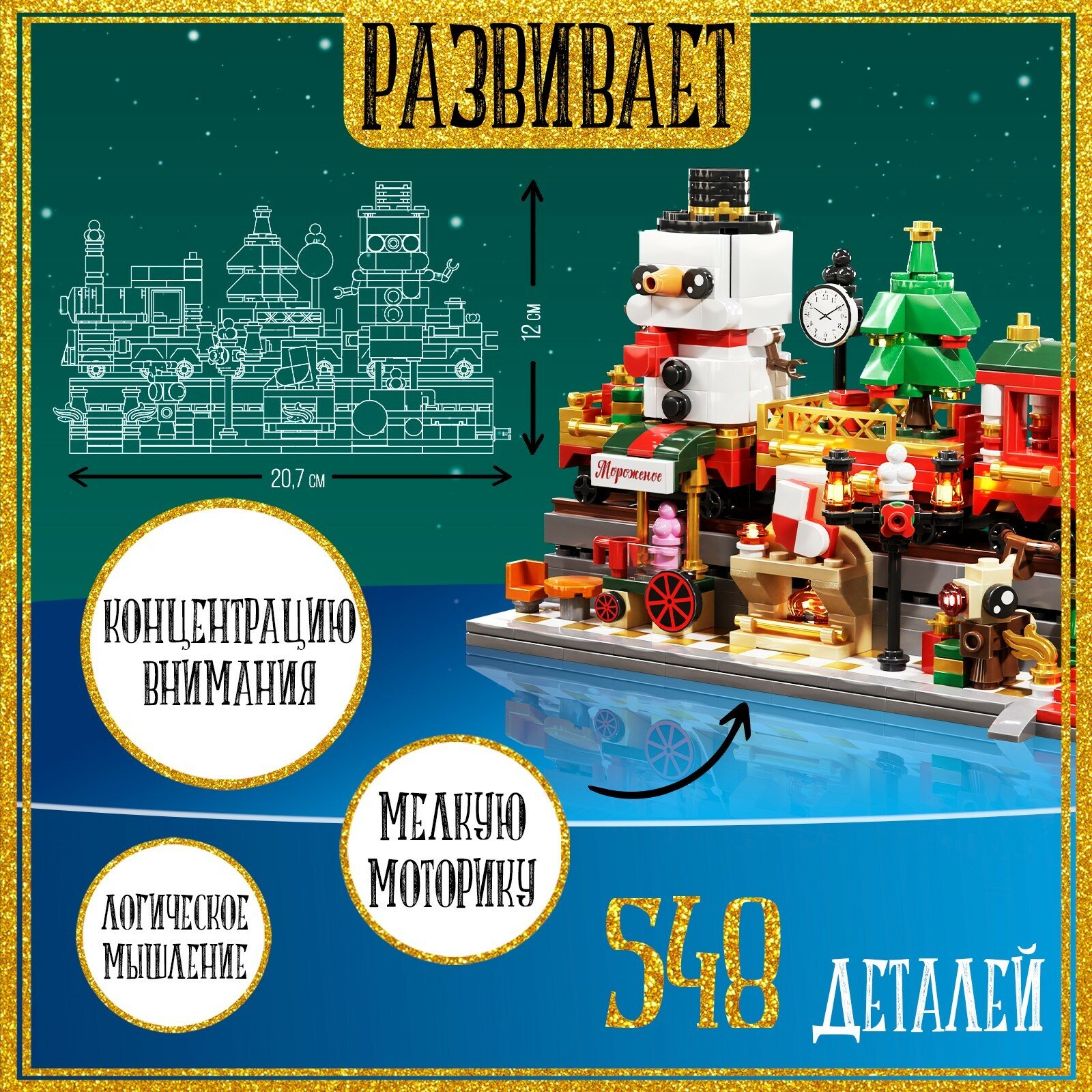 Конструктор «Новогодний экспресс» — это увлекательный набор, состоящий из 548 деталей, предназначенный для детей от 6 лет. С его помощью ребёнок сможет создать яркий и оригинальный новогодний паровозик, которая станет отличным украшением! Особенности Готовый экспресс может использоваться как праздничное украшение, добавляя атмосферу новогоднего настроения. Конструктор изготовлен из качественного и нетоксичного пластика, что делает его безопасным для детей. Игрушка легко собирается и разбирается, позволяя повторно использовать её для создания других моделей. Играем и развиваемся Сборка конструктора способствует развитию мелкой моторики и творческих способностей у ребёнка. Волшебство уже на пороге! А ты готов к чуду? Погрузись в атмосферу праздника и собери красивый новогодний конструктор!