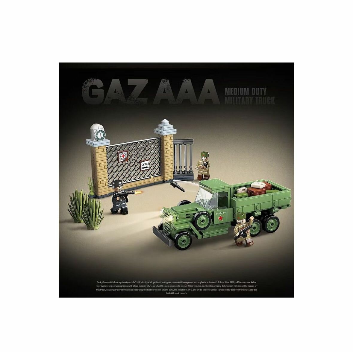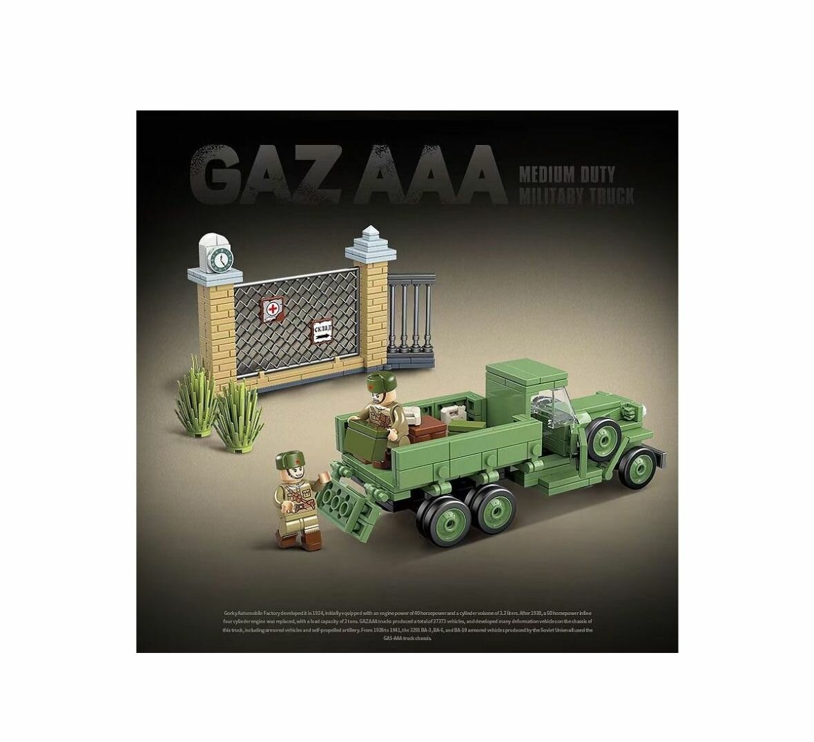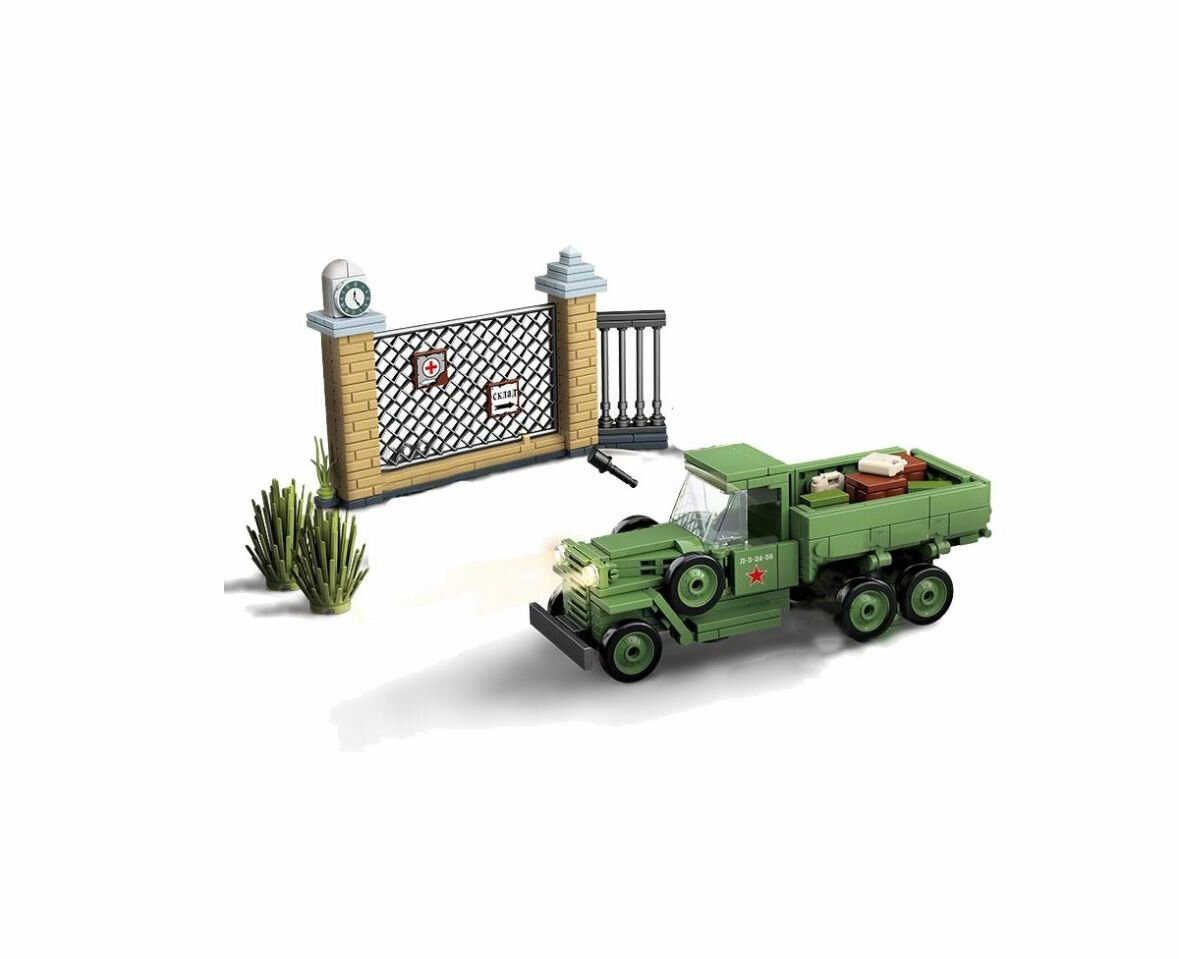 Набор представляет собой модель советского грузовика средней грузоподъемности. Данный автомобиль использовался во время второй мировой войны и применялся для перевозки людей и различных боеприпасов. В комплект конструктора входят - военный грузовик, ворота, 3 мини фигурки солдат и дополнительные аксессуары в виде оружия. С этим набором ребенок сможет в полной мере проявить фантазию и реализовать множество сюжетов военного времени! Играйте и получайте пользу! В процессе игры у детей развивается воображение, навыки конструирования, мышление и мелкая моторика.