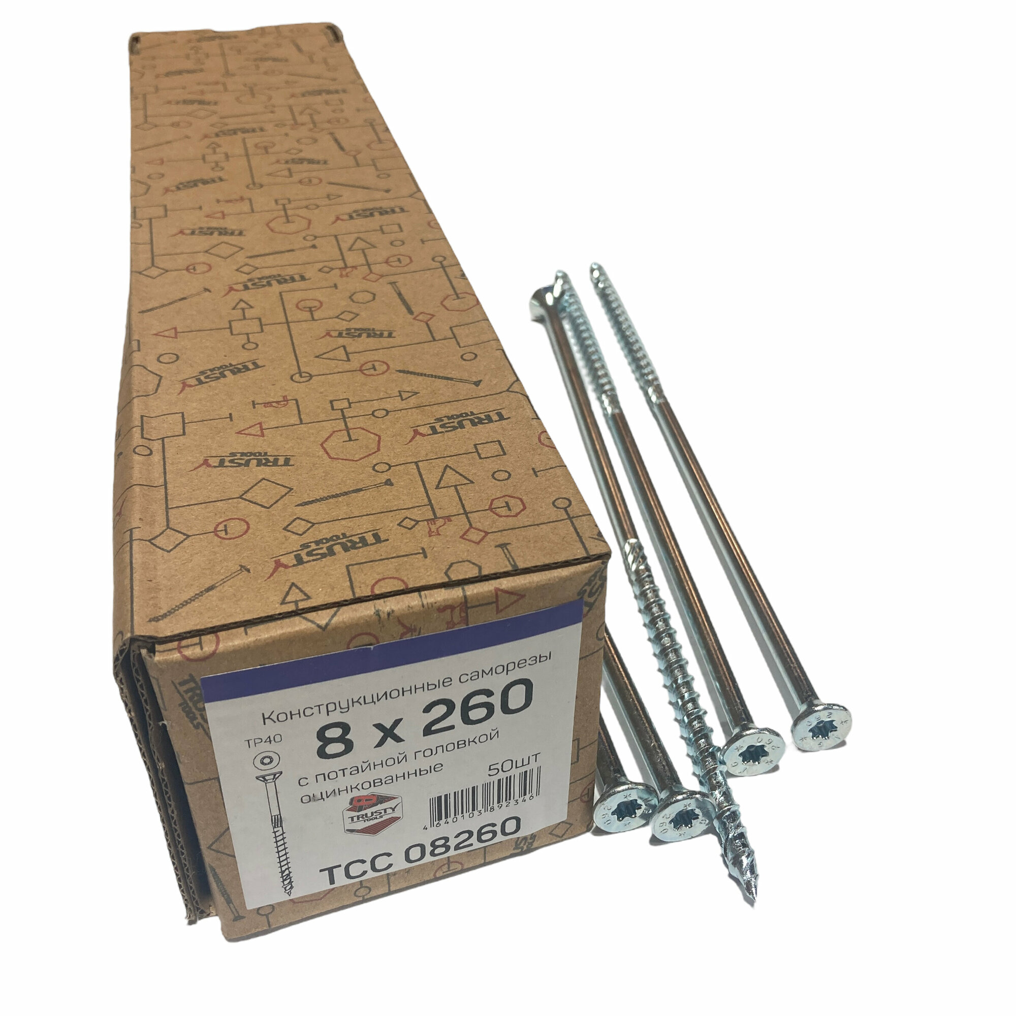 Конструкционные саморезы с зенкером для работы по дереву без предварительного засверливания. Имеют широкий диапазон применения в строительстве. Специальная резьба предотвращает раскалывание дерева даже при работе близко к краю. Головка под TORX с дополнительным стержнем обеспечивает надежную передачу крутящего момента с биты и исключает её срыв. «Резьбовая фреза» обеспечивает уплотнение стружки и облегчает вход самореза в материал.