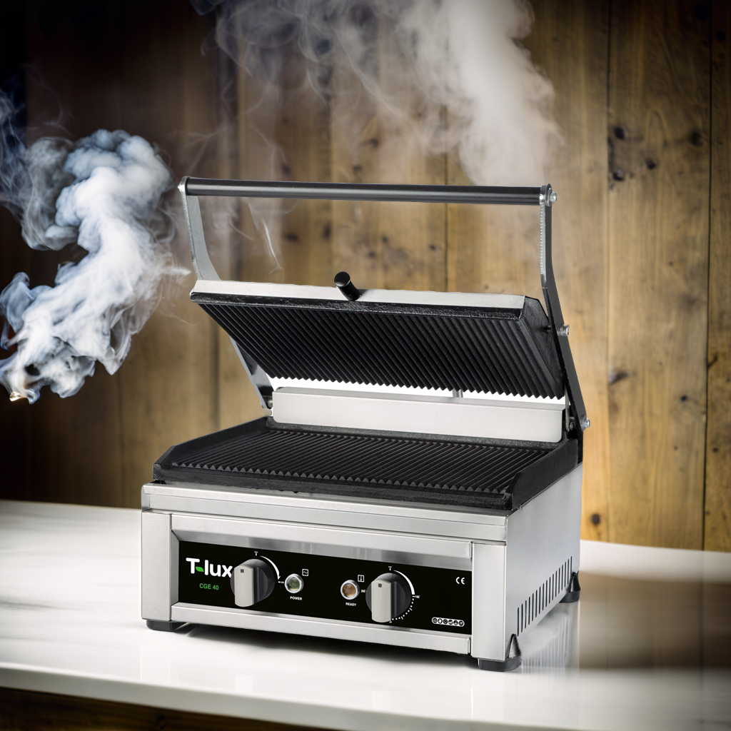 Гриль контактный T-LUX CGE 40 предназначен для жарки и разогрева мяса, птицы, рыбы, овощей, а также для приготовления стейков, гамбургеров, горячих бутербродов и сэндвичей.
