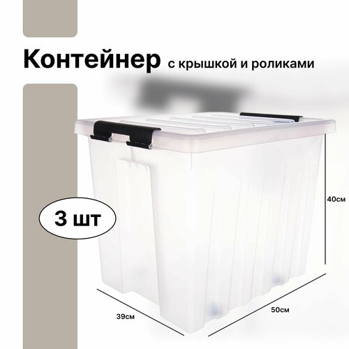 Контейнер 50x39x40 см, 50 л, пластик, с крышкой и роликами, цвет прозрачный, пригодится для складирования и транспортировки.