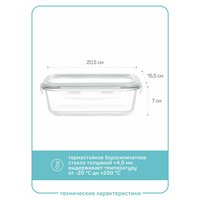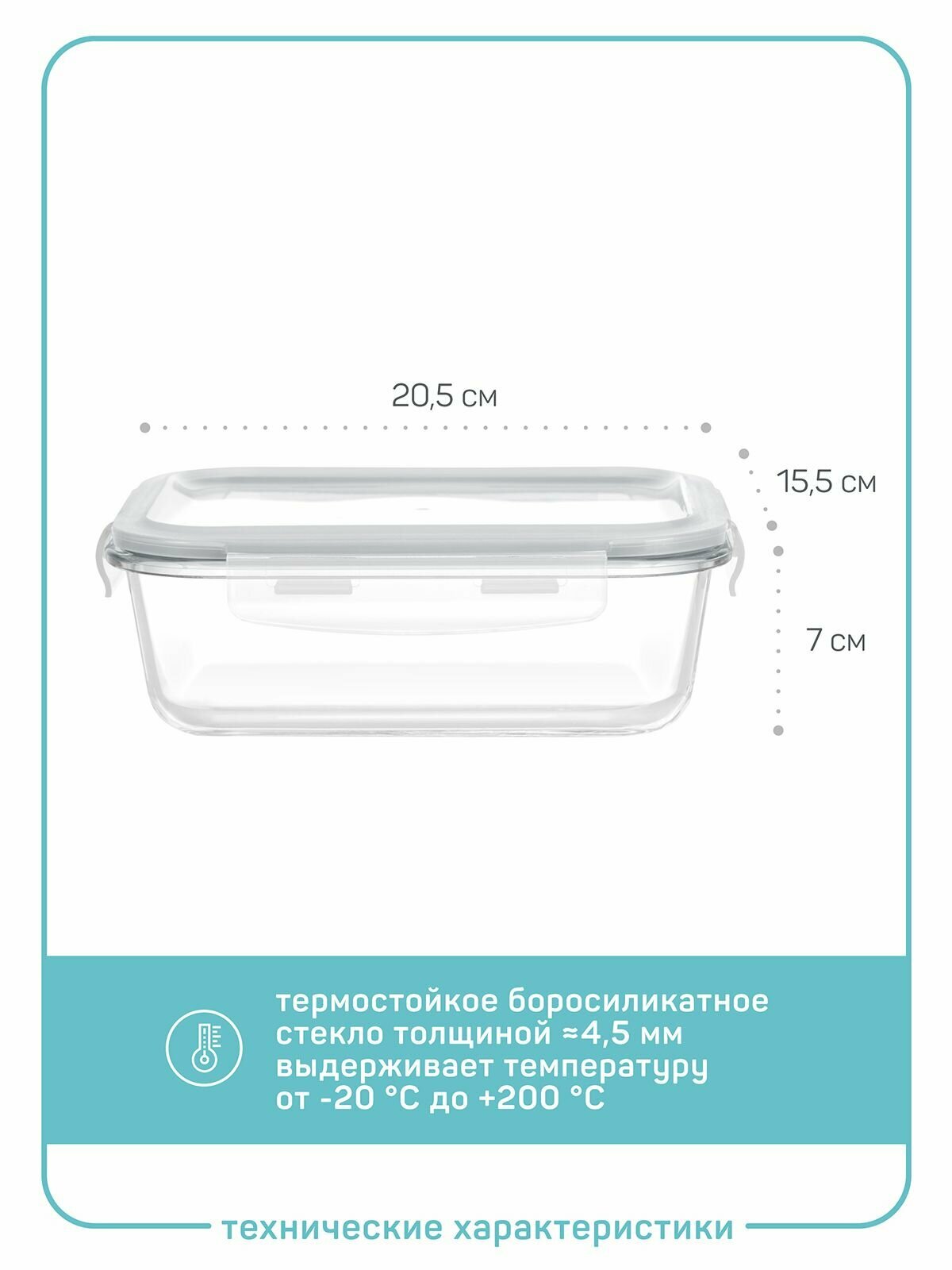 Контейнер стеклянный жаропрочный из боросиликатного стекла с герметичной пластиковой крышкой и защелками – универсальный инвентарь и посуда на кухне. Модель Кратос-1050мл. Прямоугольный, размер 20,5*15,5*7см. Температурные режим использования: от -20 до 200С. Для запекания, замораживания, охлаждения, хранения и подачи нарезок, продуктов и блюд. Можно использовать в холодильнике, мыть в посудомойке. Без крышки: в морозилку, духовой шкаф и СВЧ печь. Не впитывает запахи, не окрашивается, не протекает, не мутнеет со временем. Силиконовый уплотнитель и защелки надежно фиксируют крышку с каждой стороны. Удобно хранить, контейнеры можно ставить один на один благодаря выемке на крышке (штабелировать) в кухонных шкафах и на полке холодильника. Для последнего незаменим: вы всегда будете видеть содержимое емкости без открытия. Хранение готовых блюд в стекле считается более безопасным, чем в кастрюле или сковороде. Сохранит место и свежесть продуктов. Удержит запахи. Как салатник или блюдо для закусок - для быстрой подачи на стол достаточно снять крышку со стеклянной салатницы.
