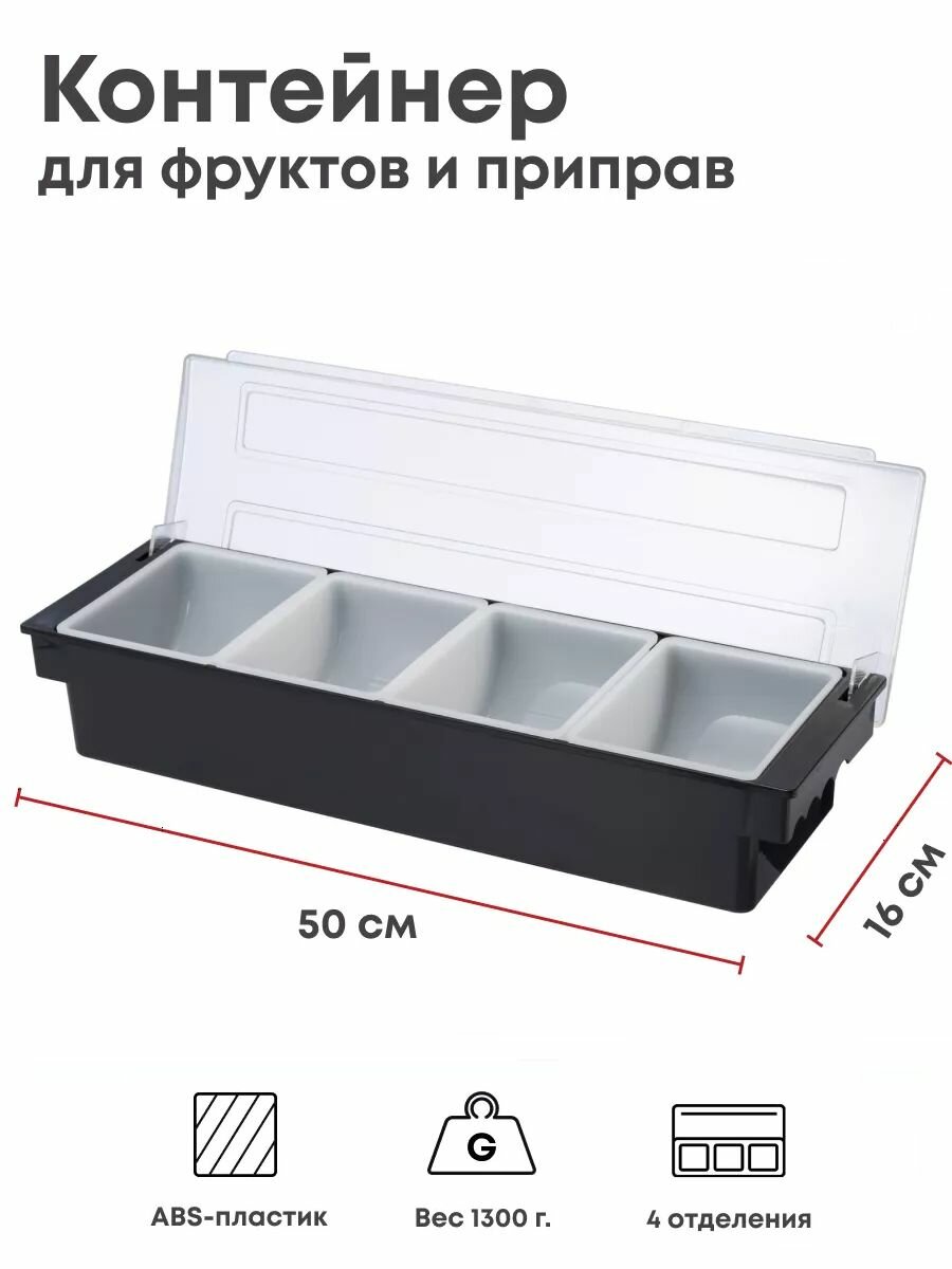 Купить Контейнер для фруктов и приправ с крышкой 4 отделения, 500х160х90мм, абс-пластик, полипропилен с доставкой по всей России. Контейнер для фруктов и приправ с крышкой 4 отделения, 500х160х90мм, абс-пластик, полипропилен: сравнение цен, характеристики, фото, актуальное наличие и цены.