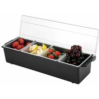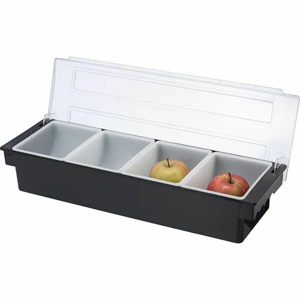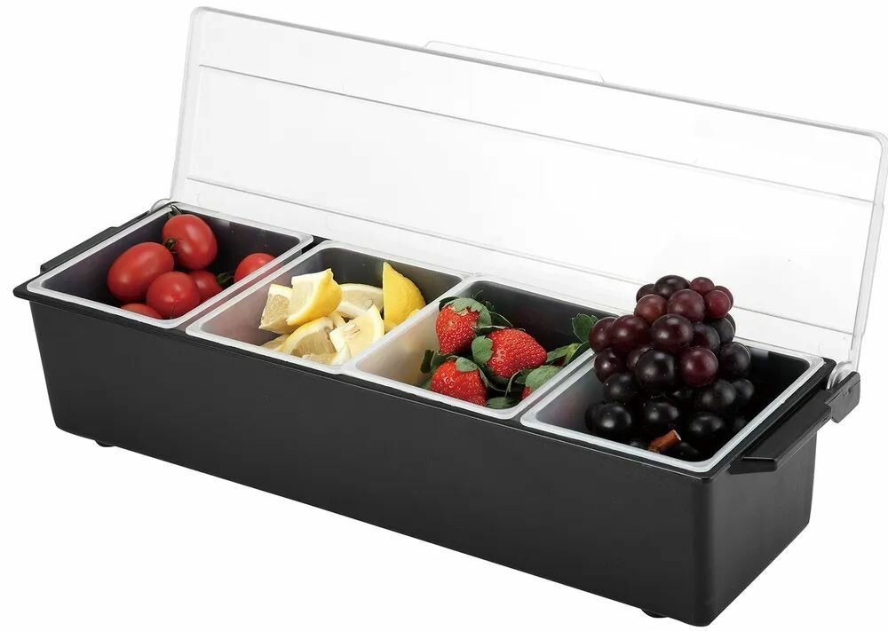 Контейнер для специй/фруктов на 4 отделения Prohotel 500х160х90мм, Абс-пластик, черный-белый br br Бренд ProHotel предоставляет огромный выбор посуды, кухонного инвентаря, кондитерских принадлежностей и многих других аксессуаров. Продукция Prohotel это идеальный вариант для оснащения заведения или первых личных инструментов для обучения и на старте карьеры.
