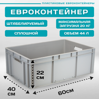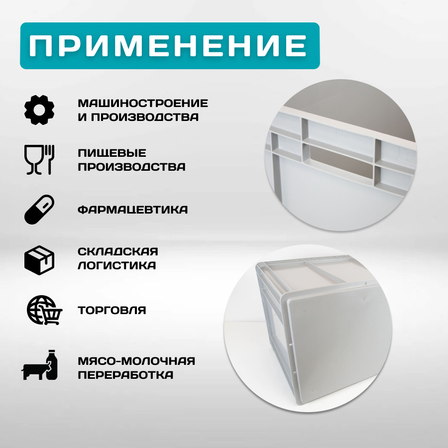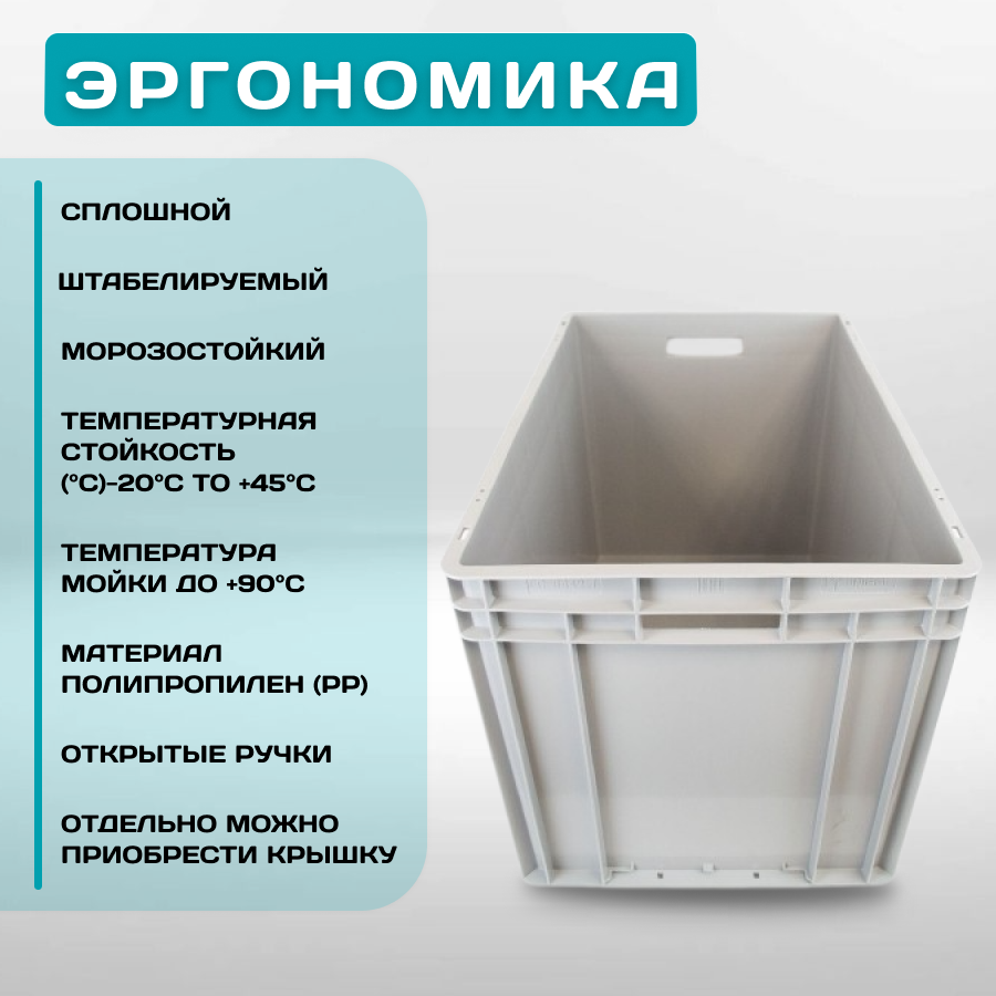 Евроконтейнер выполнен из высококачественного пластика, обеспечивающего прочность и долговечность изделия. Материалом является полипропилен (PP), который обладает отличными характеристиками: устойчивость к температуре от -20°C до 45°C, морозостоек и моющейся, а также стойкость к статической нагрузке до 400 кг. Это значит, что вы можете безопасно хранить в нем продукты питания, рыбу, мясо, овощи и фрукты, не беспокоясь о возможности повреждения контейнера.