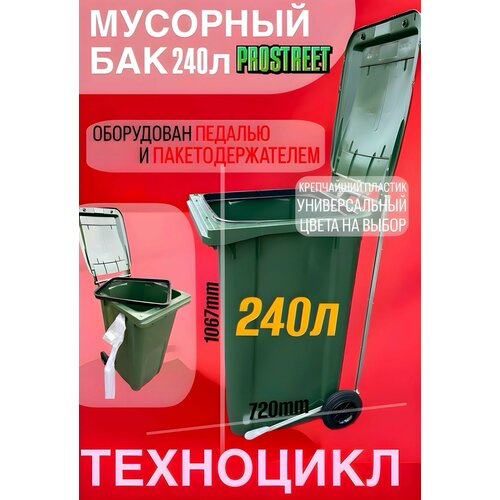 Прочный и удобный мусорный бак объёмом 240 литров предназначен для сбора и транспортировки различных видов отходов. Красный цвет корпуса выделяется на фоне других контейнеров, что удобно для маркировки и систем сортировки.