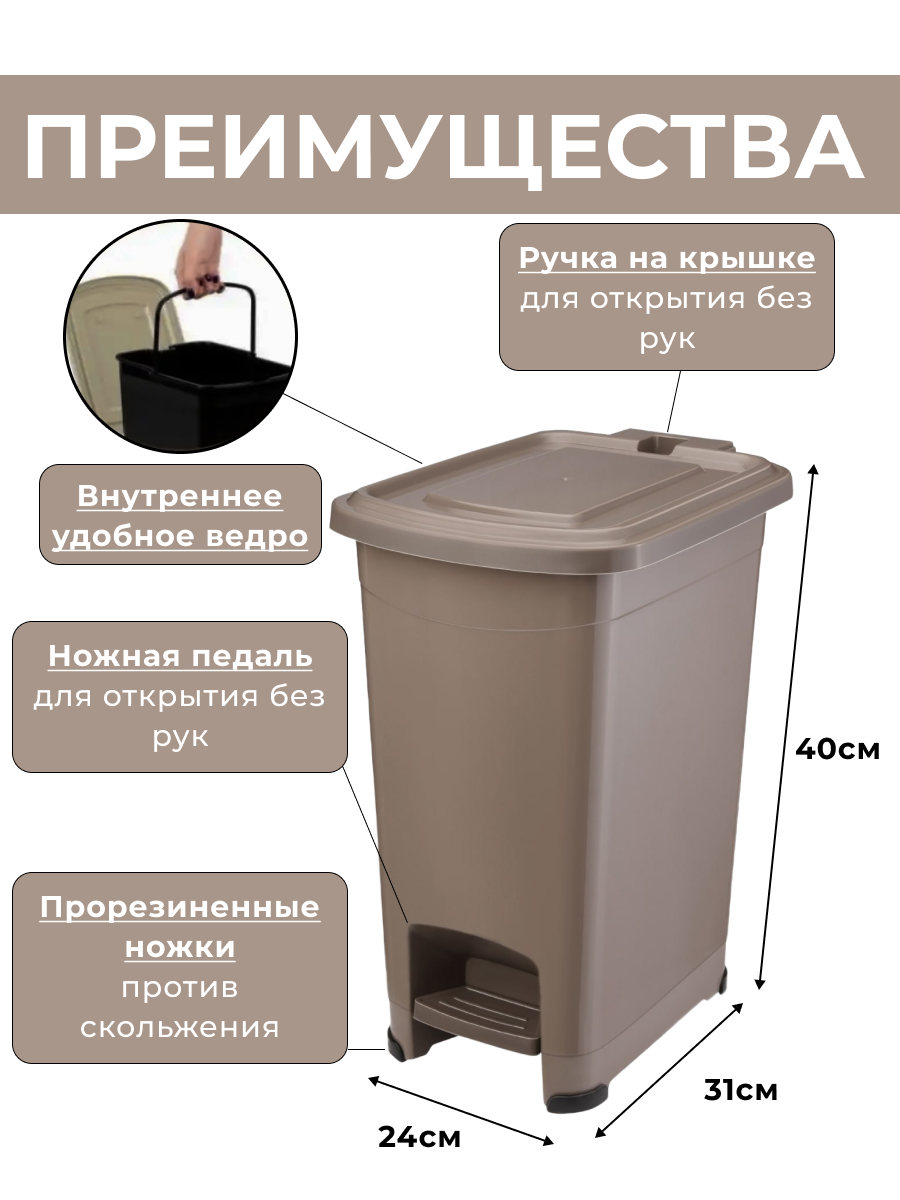 Мусорное ведро с педалью, рассчитано на объем 15 литров, отлично подойдет для ванной комнаты , туалета , кухни . Ведро для мусора изготовлено из прочного пластика и имеет съемный бак , который очень легко мыть . Корзина для мусора вместительная и компактная ведро пластиковое с крышкой абсолютно герметичное, поэтому все неприятные запахи будут заблокированы в урне. Конструкция ведра с педалью помогает поддерживать гигиену рук. Контейнер для мусора оснащён педалью , которая позволяет открыть контейнер лёгким нажатием, не дотрагиваясь до крышки. Крышка герметично , плотно закрывается, сохраняя содержимое корзины закрытым и невидимым. Благодаря своему строгому минималистичному дизайну ведро отлично подойдет для офиса, а также впишется в современный домашний интерьер так же пригодится любо мамочке как мусорное ведро для подгузников . Мусорка имеет удобную форму, являясь высокой и узкой . Такой размер позволяет использовать ее под столом как офисное ведро для бумаг . Безопасность товаров подтверждена сертификатами качества .
